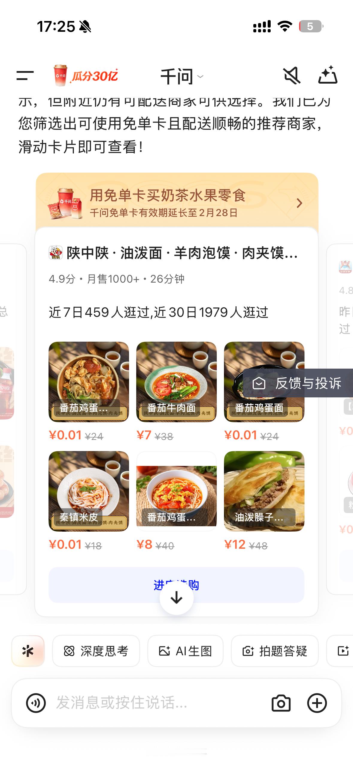 易烊千玺邀你上千问AI购物 支持易烊千玺哈哈哈。本来只想支持我哥的同时薅点羊毛,结果仔细一看发现它竟然能一键生成拜年视频!我随手上传了几张照片,给我生成了好几张氛围感满满的AI拜年照,感觉过年都不用去海马体拍照了。而且25元的免单卡真的很香,顺手点了个丰盛的晚饭。嘿嘿,易烊千玺代言的东西就是靠谱, 有惊喜到我,不仅一句话帮你点外卖、订机酒、找餐厅、吃吃喝喝一条龙,工作上也是辅助打满,调研大纲、批量处理文件、一键做ppt什么的都可以,千问的你真的很香千问免单