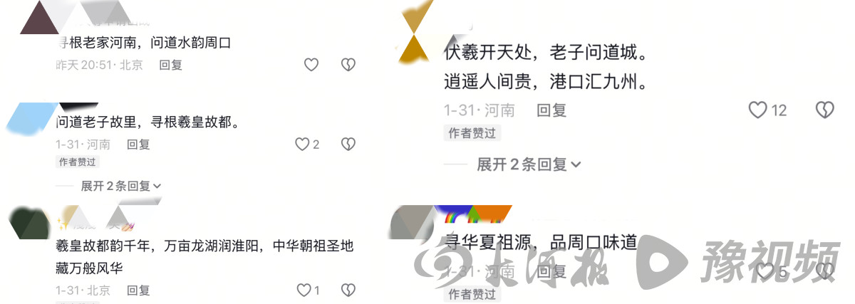 在周口文旅官方视频评论区,网友们的文案已经卷起来了。网友@赛小迦写道:“问道老子故里,寻根羲皇故都。”@陶陶创作了:“伏羲开天处,老子问道城。逍遥人间贵,港口汇九州。”还有更多简洁有力的留言涌现:“问到老子乡,寻根在周口”“周口有情,周周有请”“寻根三川,心泊周口”“天下多闯荡,老家是周口”“寻华夏祖源,品周口味道”……