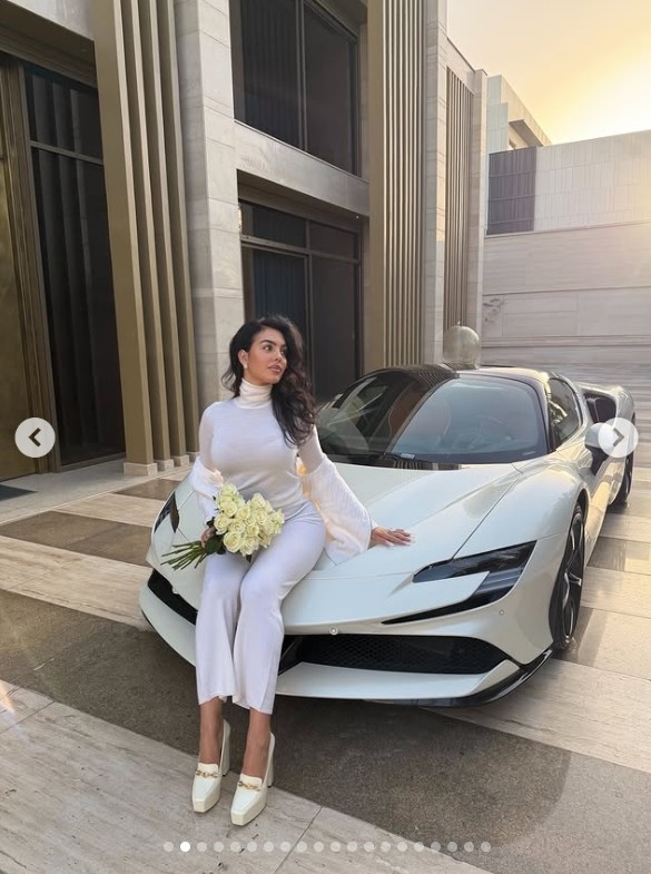 这组动态中还有乔治娜手捧鲜花与法拉利合影的照片,法拉利SF90StradaleAssettoFiorano的零售价约为44万英镑,有些车型的售价甚至更高。