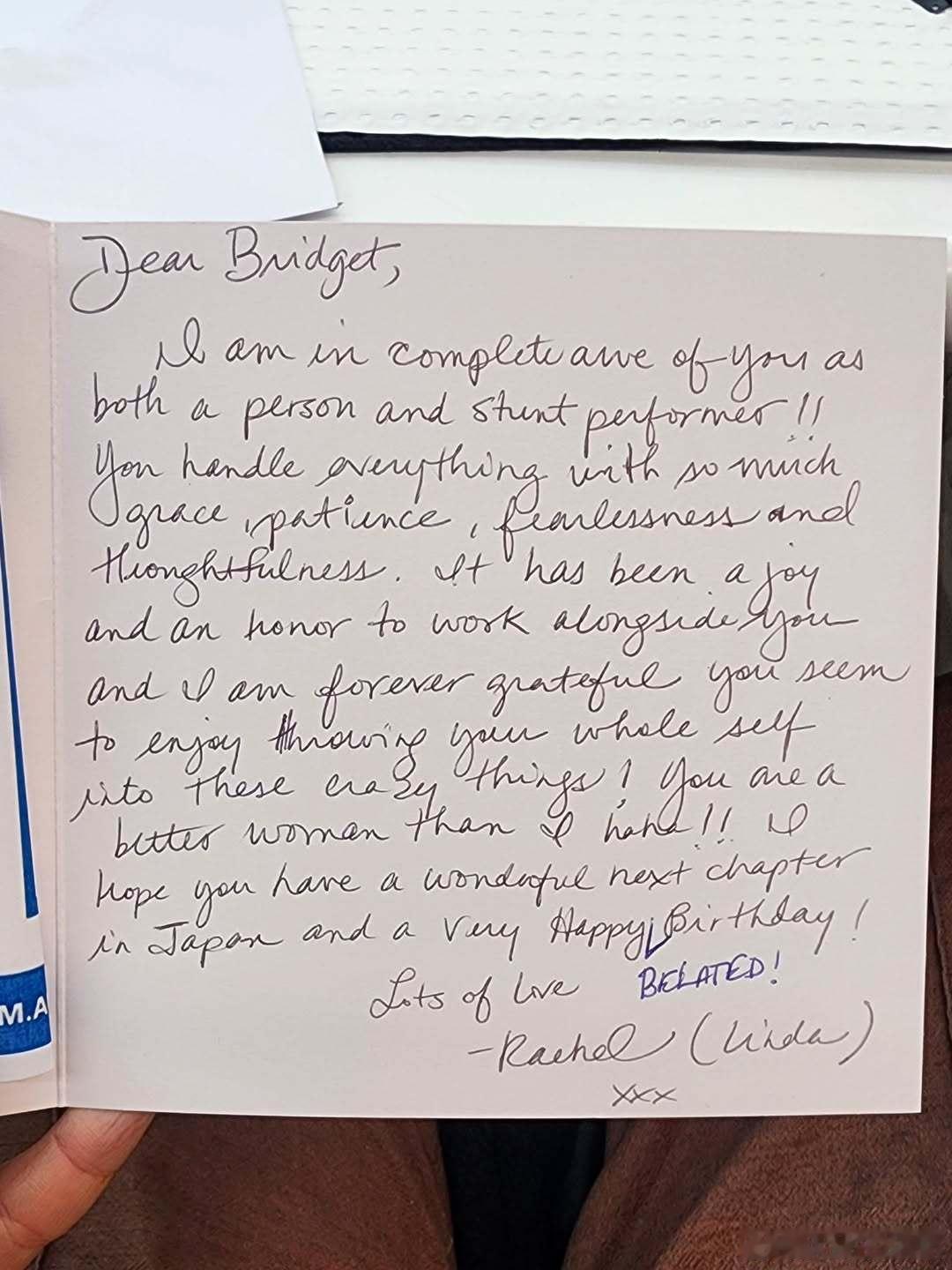 Rachel McAdams瑞秋麦克亚当斯在新片《请求救援》中的替身Bridget Burt晒出两人在片场的合影,还分享了一张甜秋手写给他的杀青感谢/生日祝福,她称甜秋不仅才华横溢还很热心善良