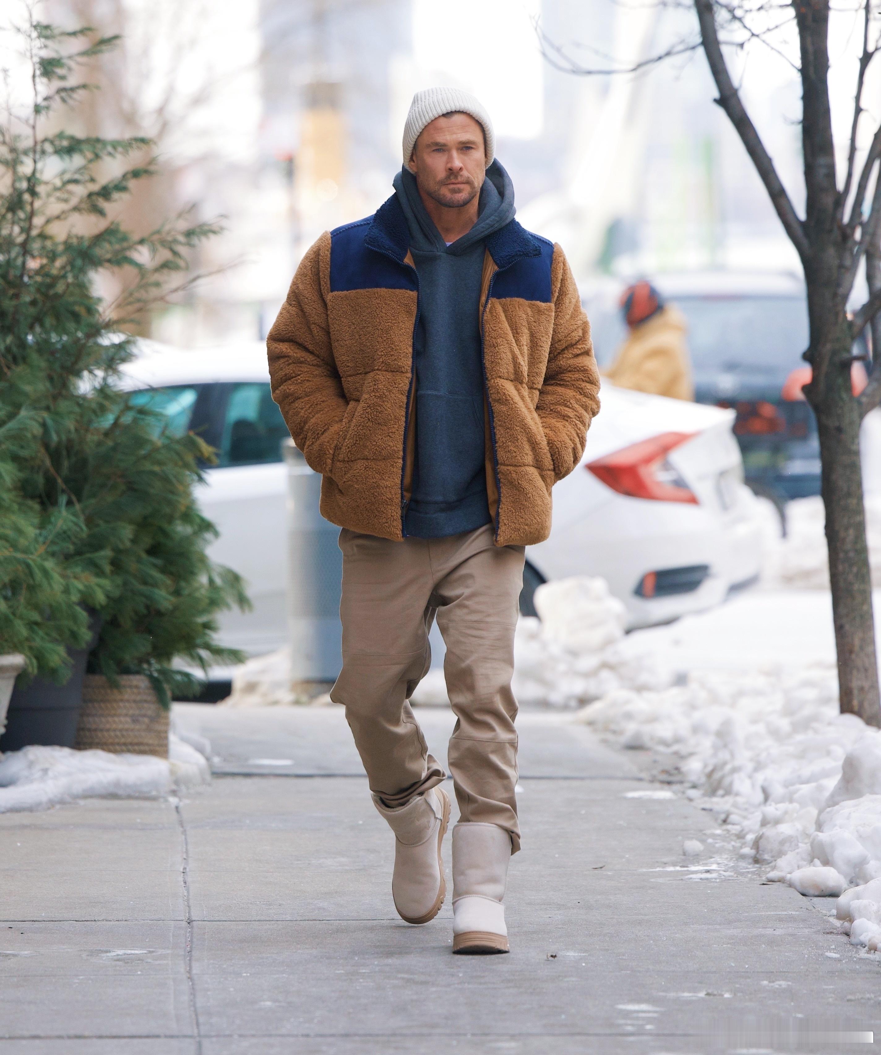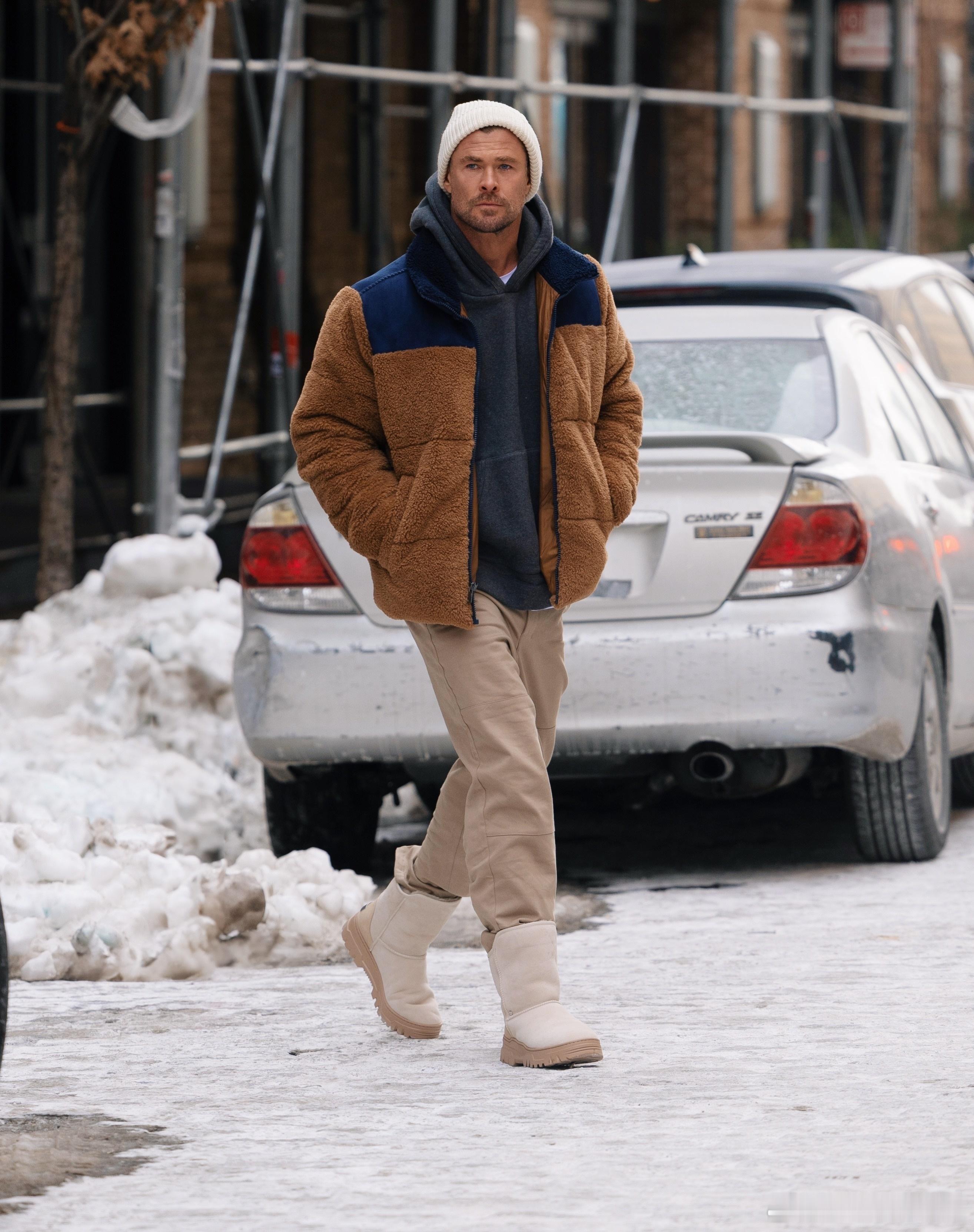 Chris Hemsworth克里斯海姆斯沃斯宣传期在纽约翠贝卡外出,穿着抓绒外套和雪地靴行走在积雪的街头