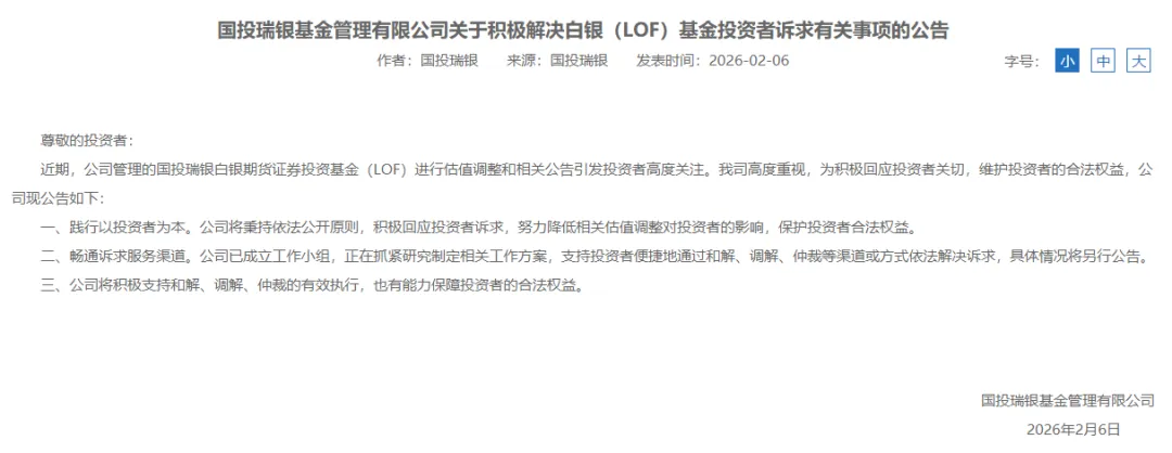 对于为何不在2月2日收盘前告知金融消费者,国投瑞银称,一是价格确定时点晚,所参考的国际主要市场价格通常在北京时间下午3点后才能最终确定,此前无法获得准确、公允的资产定价。二是存在不确定性,公司无法预测国内期货合约盘中会否打开跌停板并恢复流动性,若可正常交易,则可能无需调整估值。三是避免引发恐慌,公司担心,若在交易时间内提前公告,可能被市场解读为基金流动性出现严重问题,进而引发非理性的恐慌性挤兑,“在方案确定后再发布公告是公募基金行业的普遍惯例”。
