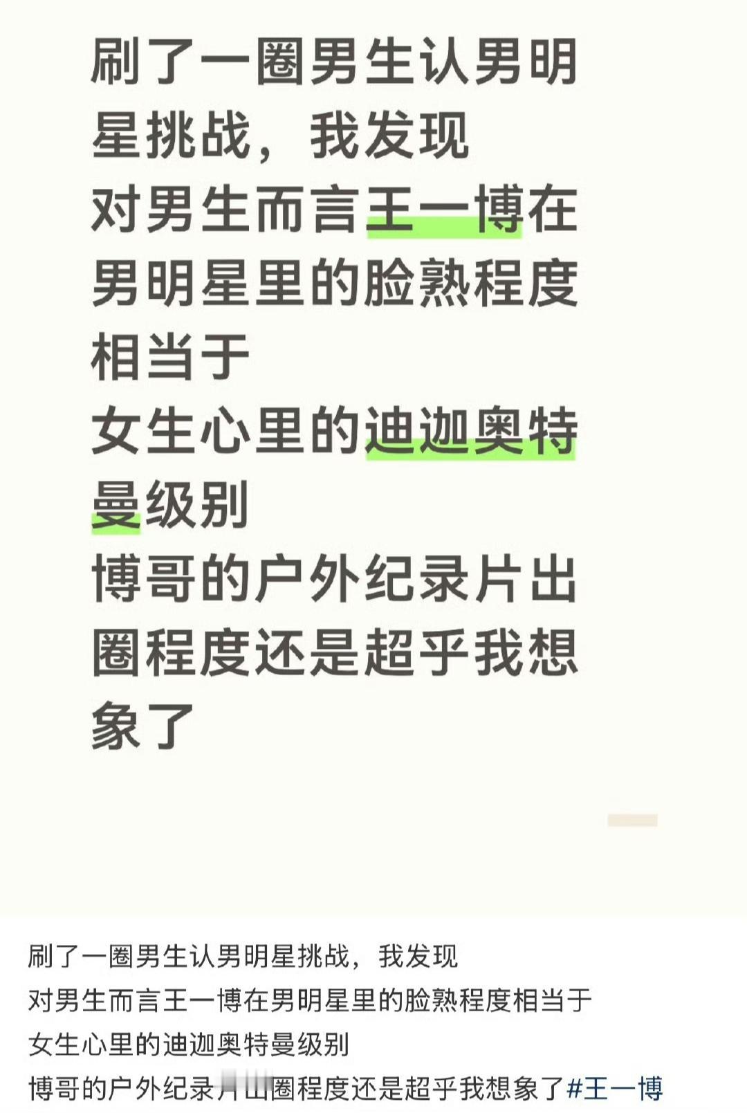 直男眼中的微博之夜男明星,刷到很多视频,几乎都是相同的反应——不同的老公不同的直男但是“认识博哥”是共通的[捂脸]。 “王一博”都是一眼认出没有半点犹豫,其余的大多数都是“不认识不知道……”[捂脸] 哈哈哈哈哈,网友总结的太有才了——对男生而言王一博在男明星里的脸熟程度,相当于女生心里的迪迦奥特曼级别[笑哭]。 走出某些限定的一亩三分地,有些人就真的无人问津无人知晓。而全能全才全面出圈的王一博,却实实在在的拥有最真实的路人缘和国民度。 王一博