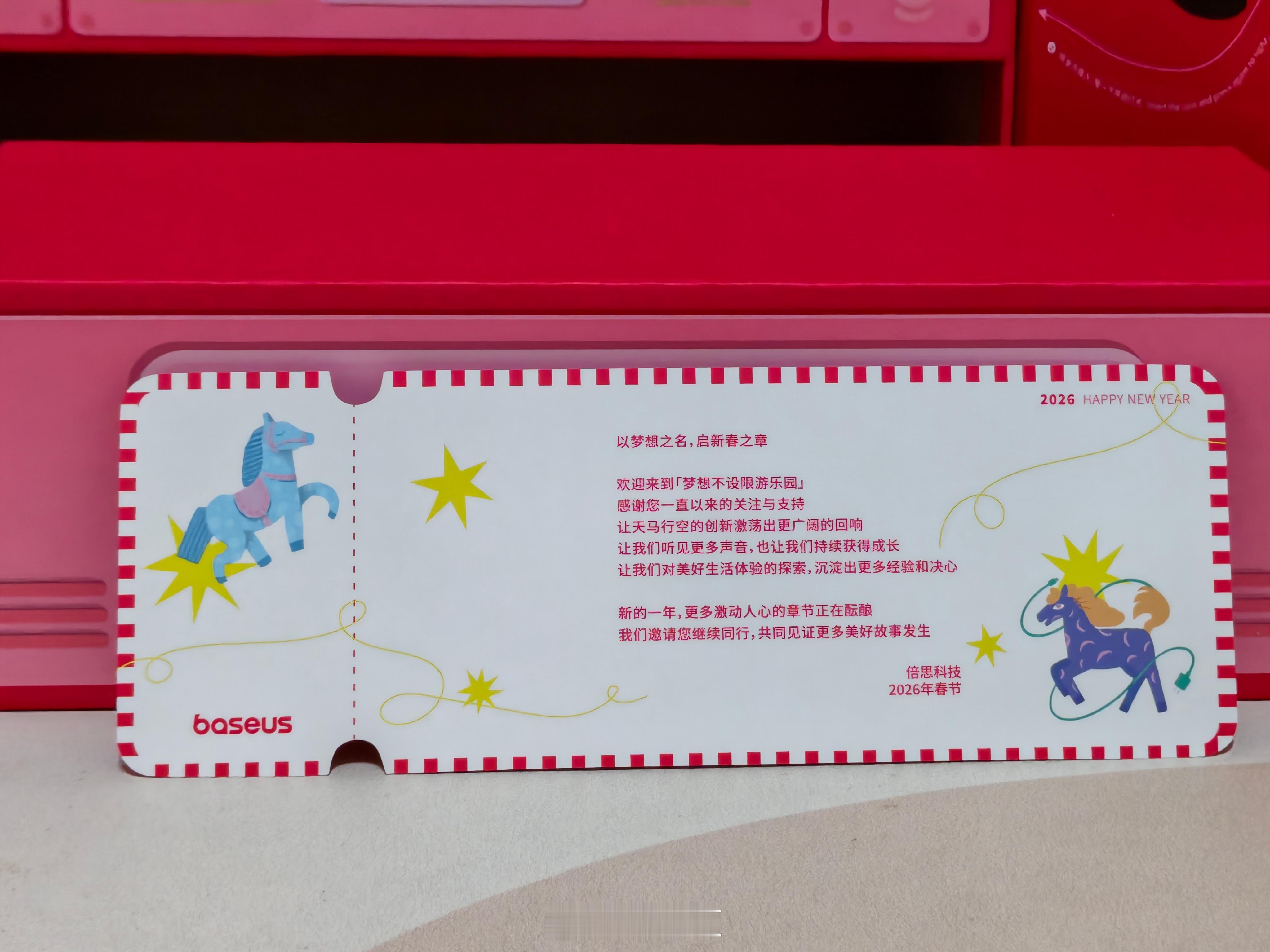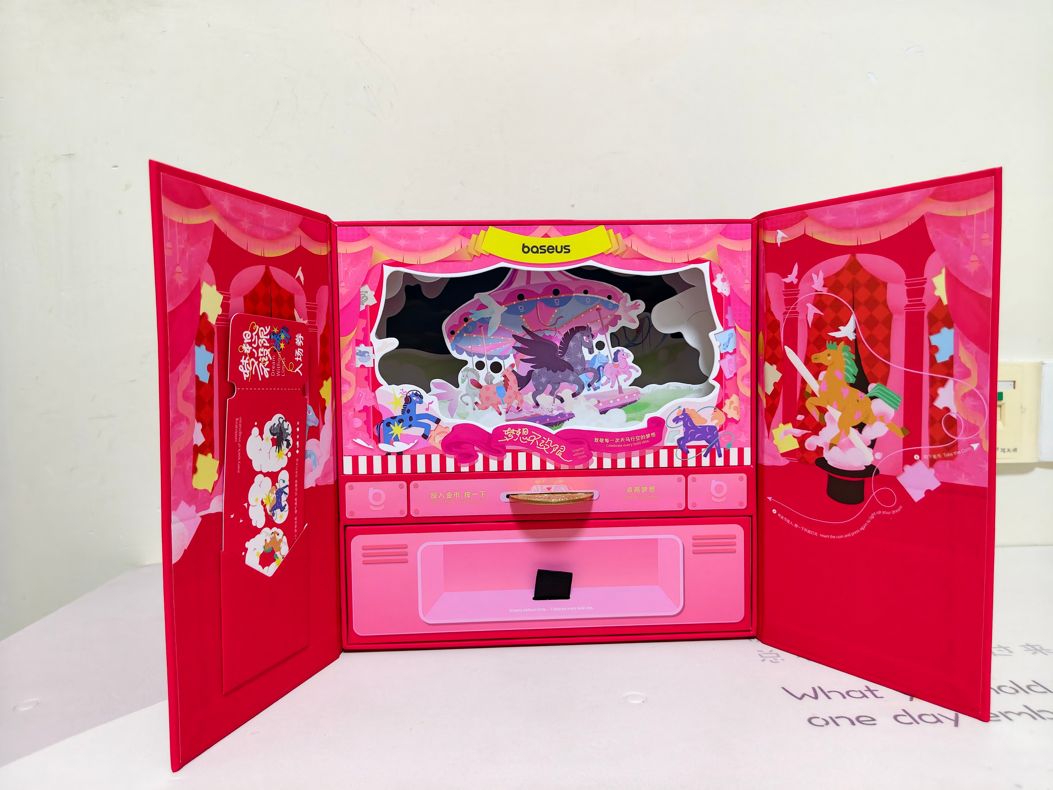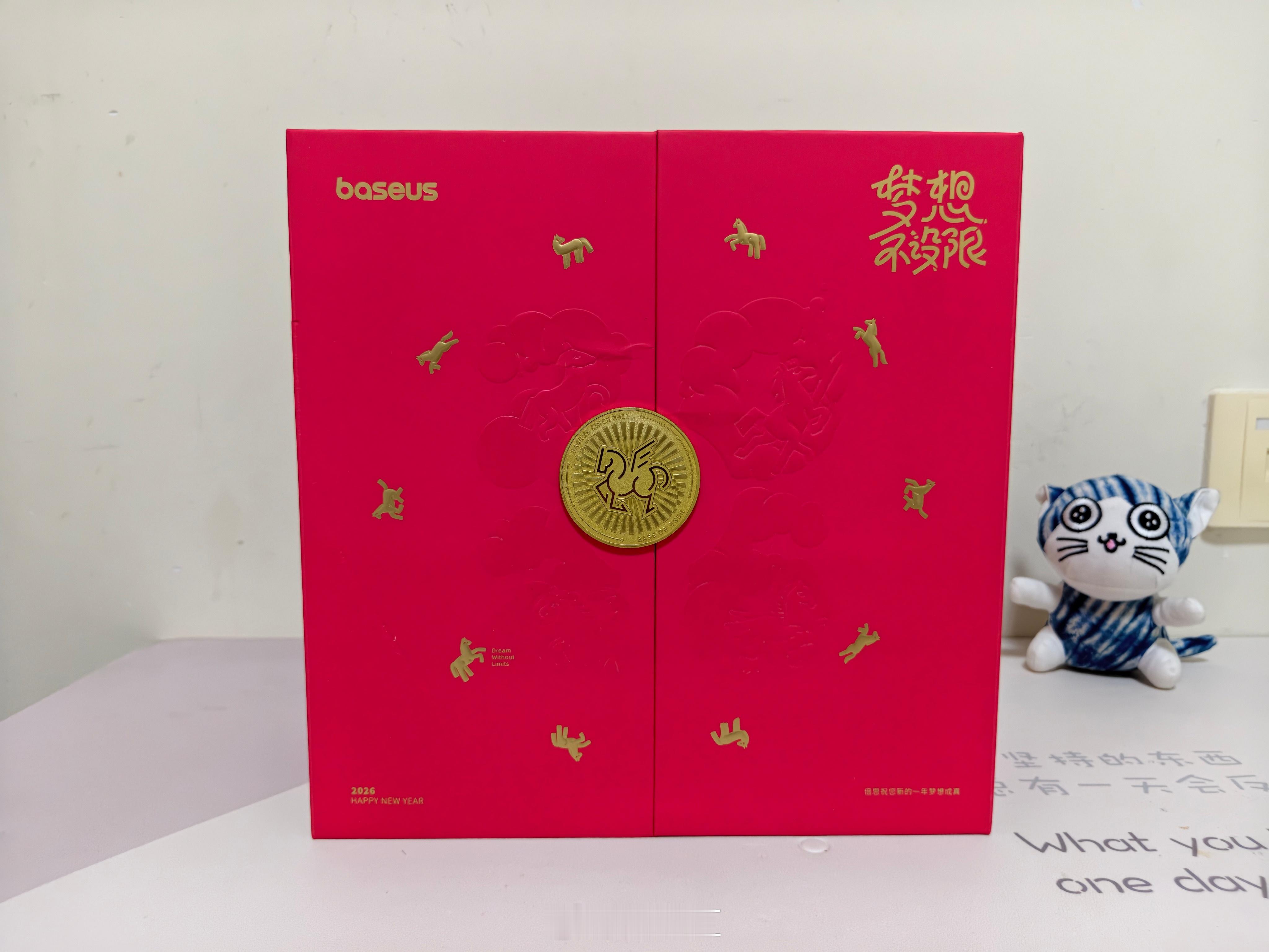 收到了倍思2026新春梦想礼盒!很有仪式感和创意,把锁扣上的金币投进去,旋转木马就会亮灯和播放音乐,新年氛围感满满。里面还有45W自带伸缩线充电宝、MC1 Pro耳夹耳机、冰箱贴、新年红包袋等。感谢!祝大家马到成功,梦想成真