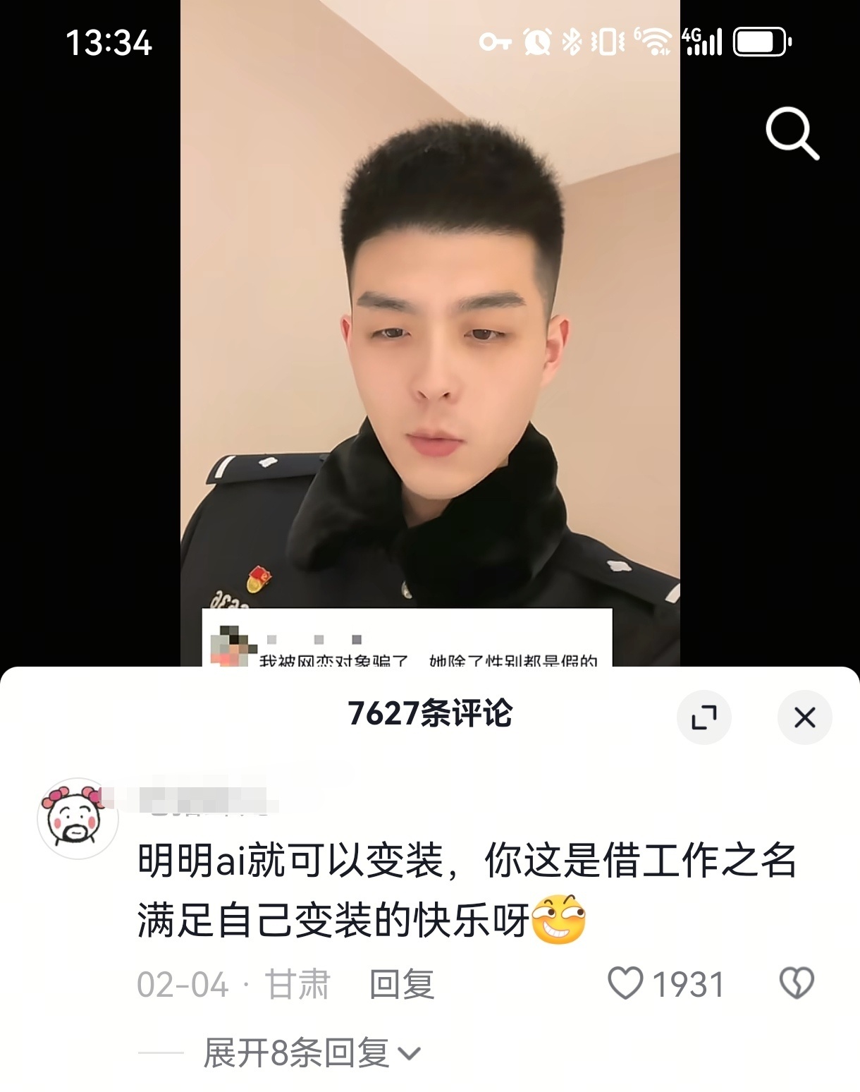 现在警讯官抖都太能整活了,在抖刷到一个警察小哥哥做反诈宣传,劝诫大家警惕网恋陷阱,留言:明明AI就能变装,你这是以工作之名自己享受变装的快乐我最近的抖真的已经被各地警察哥哥姐姐叔叔们的平板支撑手势舞和各种花式科普霸屏了,活得太正能量了