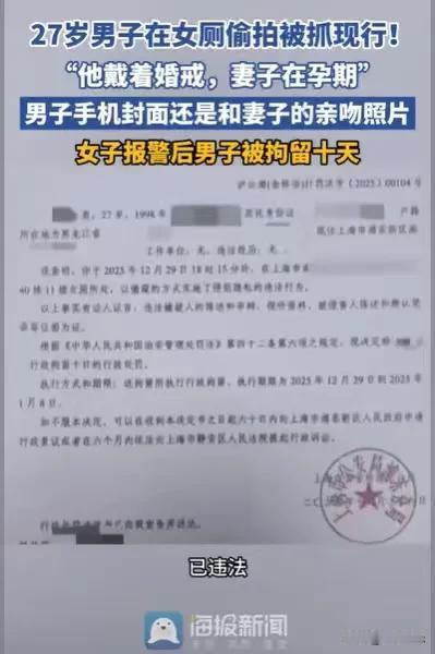 上海,女子上厕所,坐在马桶上,听到动静,她抬头一看,居然和一个男的四目相对,她瞬间愤怒,跑出来拿起手机,就对着男子怒怼,质问男子为何要偷拍,男子当场道歉,狡辩自己没有偷拍,女子不信他,让他喜提10日面壁思过,让她震惊的是,男子手上戴着婚戒,妻子怀孕,手机封面还是和妻子的亲吻照。 女子与男子四目相对的那一刻,女子内心颤抖了,感到非常害怕。 就在刚刚,她非常着急,跑进厕所,并没有注意到周围有异常,就进了女厕所,就在她坐上马桶的时候,突然听到动静,应该是有人踩滑摔倒了,她就抬头一看,正好和一个男子四目相对。 这一相对,女子马上意识到,这个男子在偷拍她,太不可思议了,上厕所的画面有什么好偷拍的,遇到这样的人也真是让她无语,这人真的太变 态了。 既然她已经逮到了这个男子在偷拍,她虽然害怕,但不能放过这个男子,更不能让自己上厕所的照片流传出去。 她马上平复了一下心情,她要赶紧拿到证据,要让这个男子付出代价。 她没有丝毫的犹豫,就赶紧拿出手机出来拍,她走出厕所,大声地向里面喊道:“出来!” 里面的男子,有些惊慌失措,低着头走了出来。 女子当场就问他了,“为何要偷拍?” 男子支支吾吾,当场就向女子道歉,却又坚称,他没有偷拍。 看着男子还在狡辩,女子就大声地喊,她本来就是嗓门高,她大声一喊,半层楼的人都听到了,男子吓得瑟瑟发抖,不敢轻易地跑出去。 不过就算女子喊得再大声,保安都没有过来,女子知道这个时候不能靠保安了,要靠她自己,她又冷静了一下,这个时候,唯有报警,才能让这个男子付出代价。 男子一听说女子要报警,就苦苦哀求,可女子不管这么多,她很清楚,饶过他这一次,他将会有无数次,会有更多的女子受害,她坚决报了警。 民警过来之后,大家得知男子的妻子已经怀孕了,可能都要生了,这个时候男子却做出这样的事情,实在令人不可思议。 而且男子手机上的封面照正是他和妻子的亲吻照,他和妻子如此恩爱,为何要做出这样的事情,这也让人百思不得其解。 女子看着男子手上的婚戒,也从男子眼中看到了害怕,或许这一刻,他意识到了自己做错了,又或许这一刻,他害怕妻子知道他所做的事情,又或许这一刻,他不甘心。 不管怎样,女子遇到这种事情,她就不能纵容男子,她坚决让男子受到应有的处罚。 女子遇到这样的事情,确实让人愤怒,上个厕所还要被别人偷拍,实在不知道这男子到底出于什么目的。 他明明是有妻子的,他和妻子明明是相爱的,他们马上就要有属于自己的孩子,他们将会是幸福的一家三口。 这个时候, 在妻子最需要他的时候,他却跑出来干出这样的事情,妻子知道之后,该会多么的伤心,她在家怀胎十月,辛苦地煎熬着,丈夫却干着这样龌龊的事情,如此缺德的事情,在她的孕期出现,或许他的到妻子想想就觉得难受。 至于这个男子到底是出于什么心理,干这样的事情,只有男子才知道,但他只要干出这样的事情,就应该为自己的行为付出代价,偷拍是违法行为。 《治安管理处罚法》第42条规定:偷窥、偷拍、窃听、散布他人隐私的行为是违法的,处五日以下拘留或者五百元以下罚款;情节较重的,处五日以上十日以下拘留,可以并处五百元以下罚款。 正因为他的偷拍行为,他被行政拘留10日,除此之外,男子的行为,如果让妻子知道了,妻子一定会很伤心,也会影响他们之间的感情,甚至影响他们的家风建设。 《民法典》第1043条规定:家庭应当树立优良家风,弘扬家庭美德,重视家庭文明建设。夫妻应当互相忠实,互相尊重,互相关爱;家庭成员间应当敬老爱幼,互相帮助,维护平等、和睦、文明的婚姻家庭关系。 作为丈夫,在妻子怀孕期间,就应该用心呵护妻子,把心思放在妻子身上,而不是干一些违法缺德的事情。 那么你对这男子的行为有何看法呢?