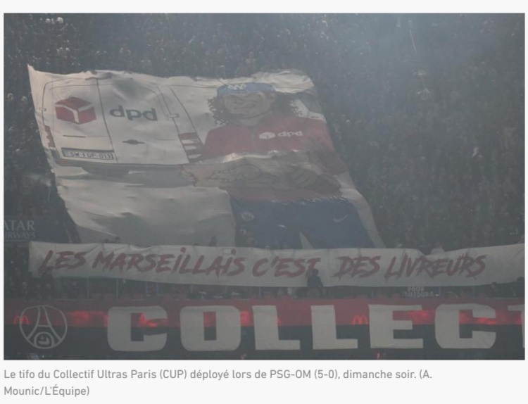 这一被篡改但具有冒犯性的巨幅横幅影响恶劣。专营包裹运输与配送业务(隶属于法国邮政集团)的DPD公司本周一发布公告,表示遗憾其“公司标识被篡改,并用于传达具有攻击性且违背其所捍卫的价值观的信息”。这是在巴黎圣日耳曼队与马赛队比赛(5比0)次日作出的明确回应。比赛中,巴黎球迷展示了一幅巨幅横幅,上面写着“DPD”和“马赛人就是送货员”。