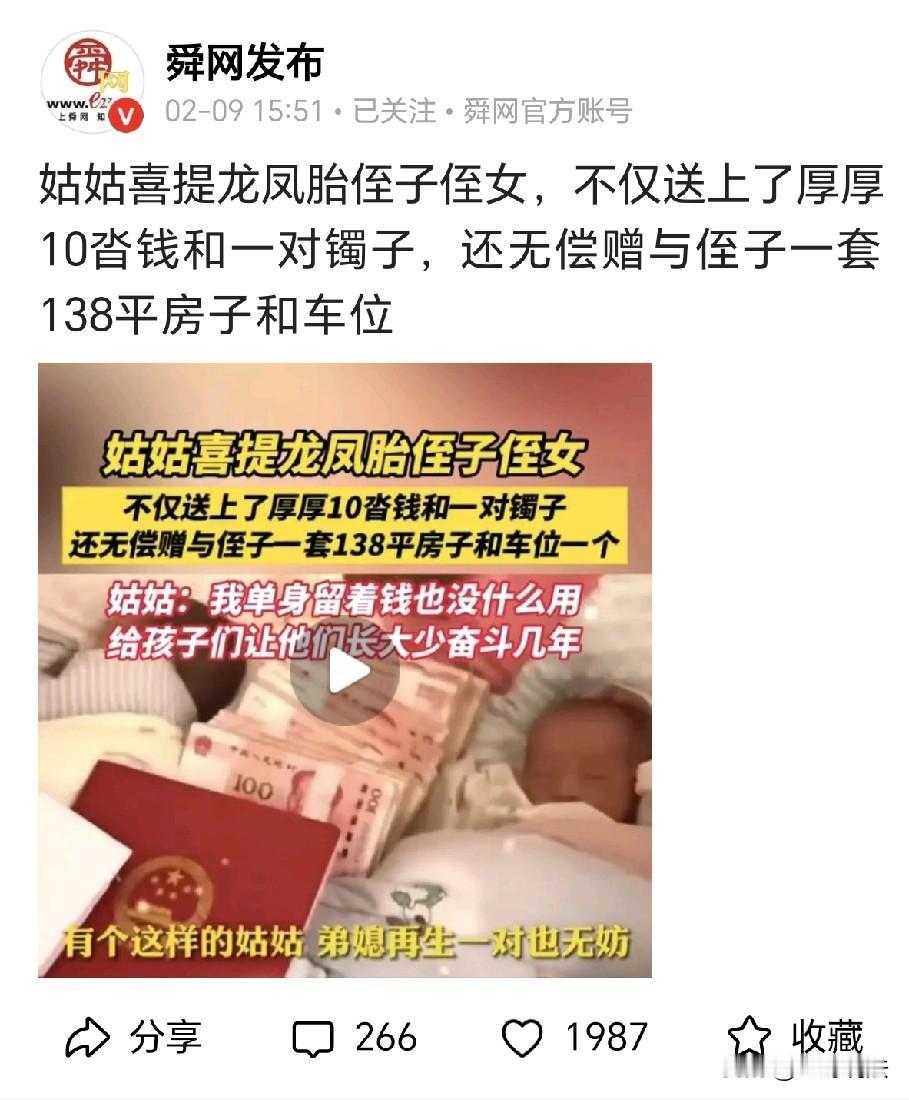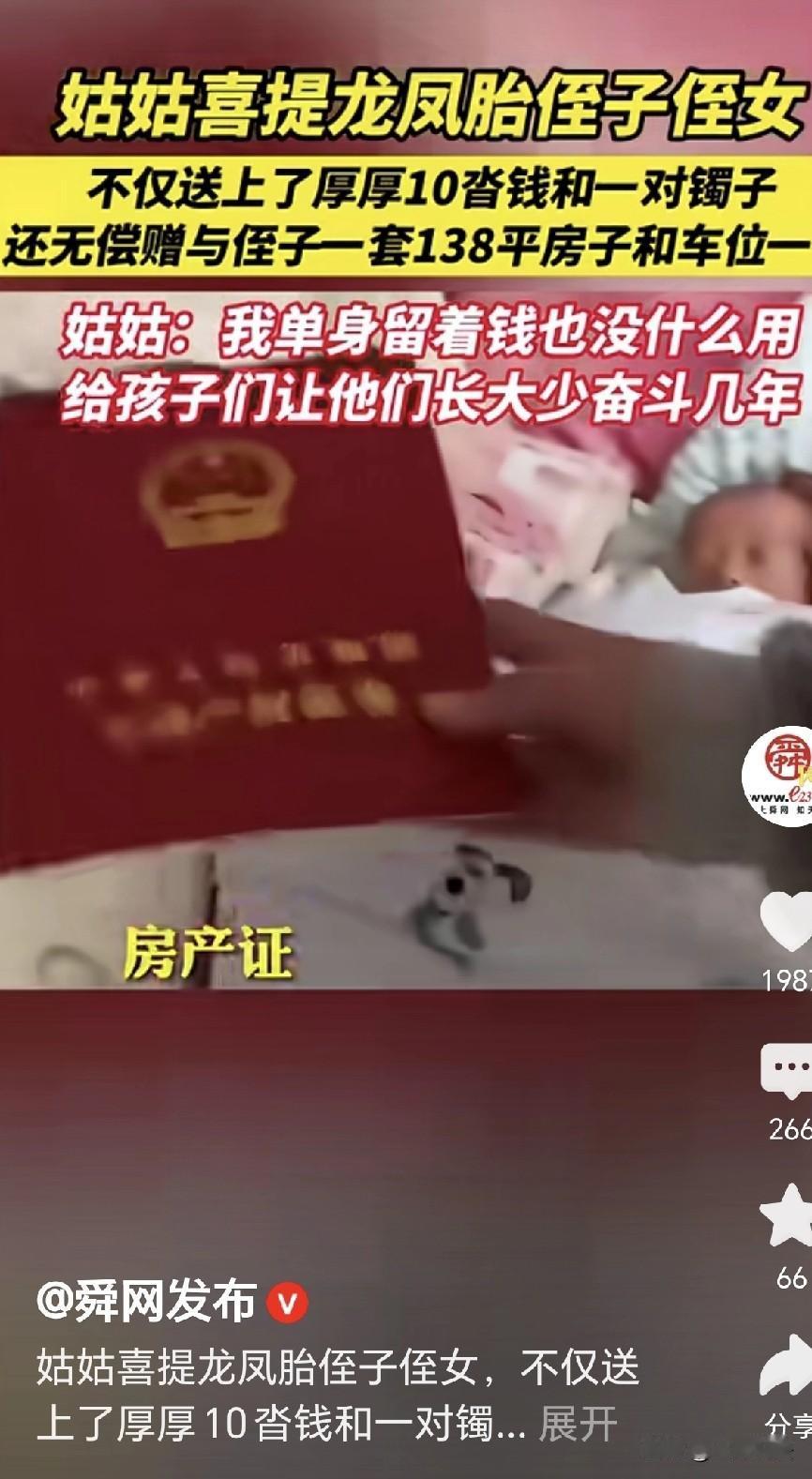 一女子是单身,弟弟生下龙凤胎宝贝,女子当了姑姑,她大喜过望,送给宝宝10摞现金和一对镯子,又送侄子一套138平房子和车位,弟弟推辞,这礼物太贵重,女子: 我单身留钱没用,给孩子让他们长大后少奋斗几年! 一女子一直单身,她独立特行,认为婚姻本身没什么意义。 可是弟弟结婚,她送上祝福,祝他们幸福美满,早生贵子。 女子知道,每个人的选择不同,各自都有自己的人生轨道,作为一个女子,就更加的不易,一旦结婚,就没了自己的生活。 她是个事业型的女子,她惧怕那些锅碗瓢盆,还有那些油盐酱醋,她喜欢独处,一个静静的品尝着美食。 她喜欢懒觉,一觉睡的天昏地暗,没有谁催着做饭,也不用送孩子上学。 这生活她接受不了,因此她选择了单身不育,她把更多的重心搁在了工作,换来的是大把的金钱,工作给了她巨大安全。 如果她要是结婚,就没有时间在保持现状,为了对自己负责,她坚持保持这样的生活 对于她的选择,父母没有逼她做出什么,家里还有弟弟给父母撑门立户。 可是她依旧喜欢孩子,弟弟弟媳生下来一对双胞胎宝贝。 这个消息令她欣喜若狂,从此后她的身份就晋升为了姑姑。 虽然她自己不婚不育,但也挡不住她喜欢孩子,既然兄弟生了孩子,侄子侄女一样和她同脉相连。 她急急火火就赶回来家里,那一对龙凤胎宝宝白白胖胖,在襁褓中懵懂的看着姑姑。 女子心疼的抱住孩子,一股暖意从心头袭来。 她拿出厚厚10沓钱和一对镯子递给了弟媳,又拿出一本138平的房产证和一个车位证搁在侄子身边。 她告诉弟弟弟媳,这是给孩子们的礼物。 弟媳瞪大了双眼,这礼物未免太过贵重了。 弟媳不好意思,弟弟更是往外推辞,你还有自己的日子要过,怎么能把自己的财物都给了我的孩子。 谁知女子话锋一转,谁说他们只是你的孩子,我是姑姑,和他们是同脉连枝。 虽说孩子是你俩生的,他们一样也是我的孩子,反正我是单身,留钱也没什么用,给孩子们让他们长大少奋斗几年! 有人希望,这样的姑姑给我来一堆吧! 也有人说这姑姑太傻,除非她年满六十岁不再结婚,不然以后有她后悔的时候。 也有人说,人家钱多,没孩子,你不会是以为这是她的全部家当? 更有人说,姑姑应该细水长流,即便再爱,也要一点一点给,钱财这个东西,不到最后不要轻易送出去。 各人有各人的看法,各人有各人的活法,也许姑姑没想着回报,这是她的心意,无所谓孩子会不会感恩于她。 还有人说,这姑姑偏心,为啥只给侄子不给侄女,等侄女长大,你这不是拉仇恨吗? 视频发出,网友们扎锅,众说纷纭,说着自己的看法,有位网友分享了经历。 她说我工作后,每年生日都会给侄子买过年衣服,可是等我结婚生子,俩娃从没收到过舅舅舅妈的生日礼物。 从此以后,我就再也没送过,人家还说我结婚以后变抠了,再后来,我妈说我嫂子只进不出,我做的是对的。 相信很对人都遇到过这样的事情,只是没机会说出来而已。 各家都有各家的情况,无论如何,姑姑给出的这一刻的确令人震惊,有这样的姑姑,即便弟弟再生一对也不发愁了! 这位单身姑姑的做法,着实引发了大家的热烈讨论,在我看来,这背后有着诸多值得思考的地方。 姑姑坚持不婚不育,把更多精力放在工作上,这是她对自己人生的一种选择,没有对错之分。 每个人的人生轨迹本就不尽相同,只要自己过得舒心、负责,旁人无需过多指责。 她虽未选择婚姻和生育,但对孩子的喜爱丝毫不减,弟弟家龙凤胎的诞生让她欣喜若狂,这份对亲情的珍视十分动人。 她大手笔地送出厚礼,有人觉得她傻,担心她日后后悔;也有人羡慕有这样的姑姑。 其实,这恰恰体现了姑姑的纯粹和豁达,她没想着回报,只是单纯地想为孩子们助力,让他们少些奋斗的艰辛, 这份无私的爱值得我们赞赏。 也有人质疑她重男轻女,只给侄子房产而没提侄女,也许姑姑自有安排,我们不应过早下结论。 每个人都有表达爱的方式,只要这份爱是真诚的,就值得被尊重。 我们也不必用自己的标准去衡量他人,尊重每个人的选择和生活方式,才是正确的态度。 对此,你怎么看?欢迎评论区留言讨论。