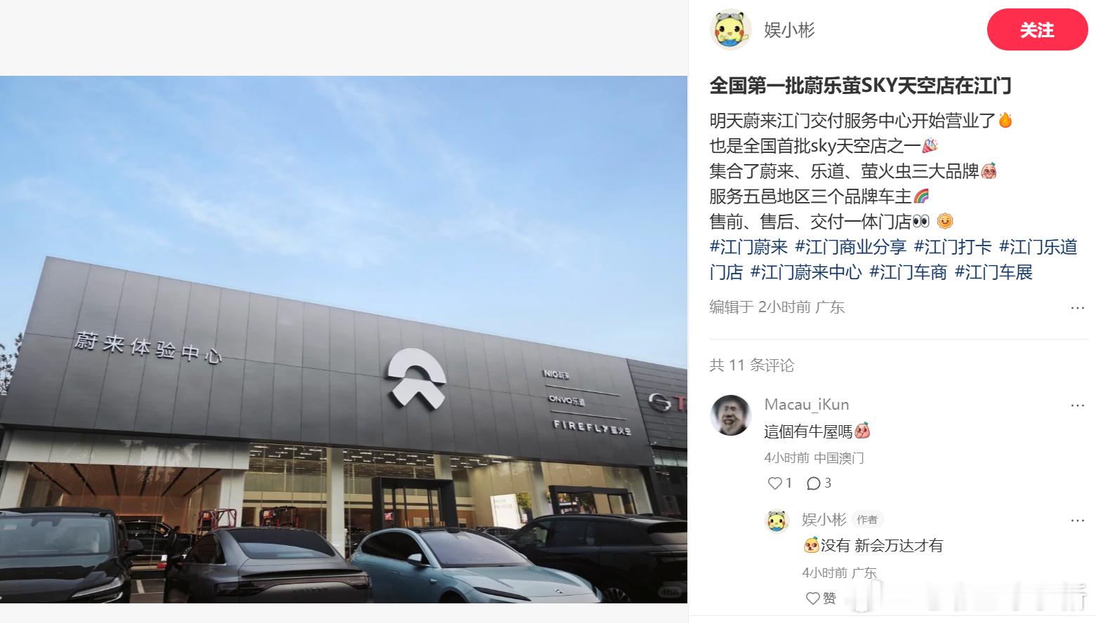 首批「蔚乐萤」综合店来了!有网友在广东江门发现了「蔚乐萤」综合店,这个门店将在明