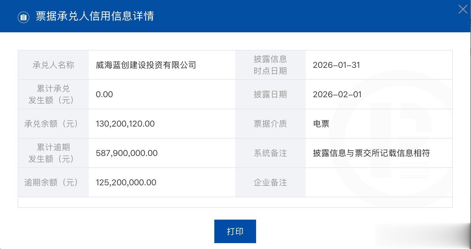 上海票据交易所最新披露数据显示,截至2026年1月31日,威海蓝创建设投资有限公司(下称“威海蓝创”)票据承兑逾期余额已达1.25亿元,累计逾期发生额更是高达5.88亿元。