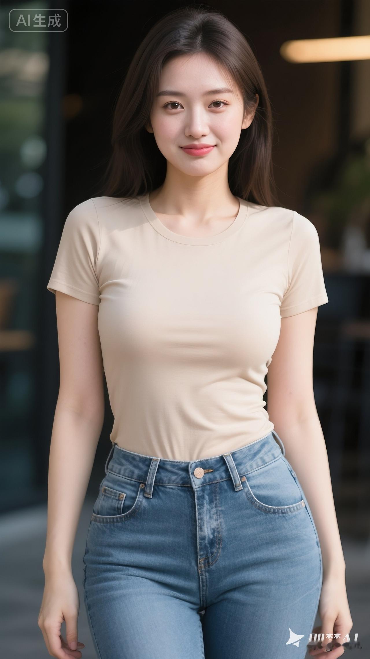 她留着一头柔顺的深棕色长发,妆容干净,眉眼温柔,嘴角带着浅浅的笑意,给人一种亲切又治愈的感觉。随性穿搭
