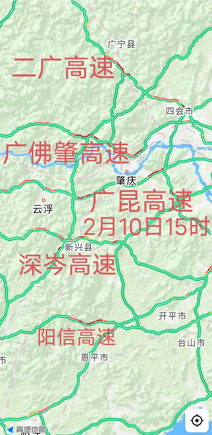 2月10日15时,广州和佛山等地开车会广西南宁和玉林还有梧州和贺州等地过年的车流量达到高峰,G80广昆高速肇庆至云浮段车流量巨大,拥堵缓行的路段非常明显,G55二广高速四会至广宁段车流量大,车辆缓行路段在20公里以上,广佛肇高速肇庆鼎湖至德庆凤村路段拥堵比较严重,特别是与汕湛高速汇合的西角枢纽路段,G2518深岑高速新兴路段车流量大,部分路段有不同程度的拥堵缓行,S26中阳高速恩平良西镇路段有15公里以上的严重拥堵区,预计今明两天广东开车会广西过年的车流量任然非常大,长途出行提前做好规划注意行车安全。