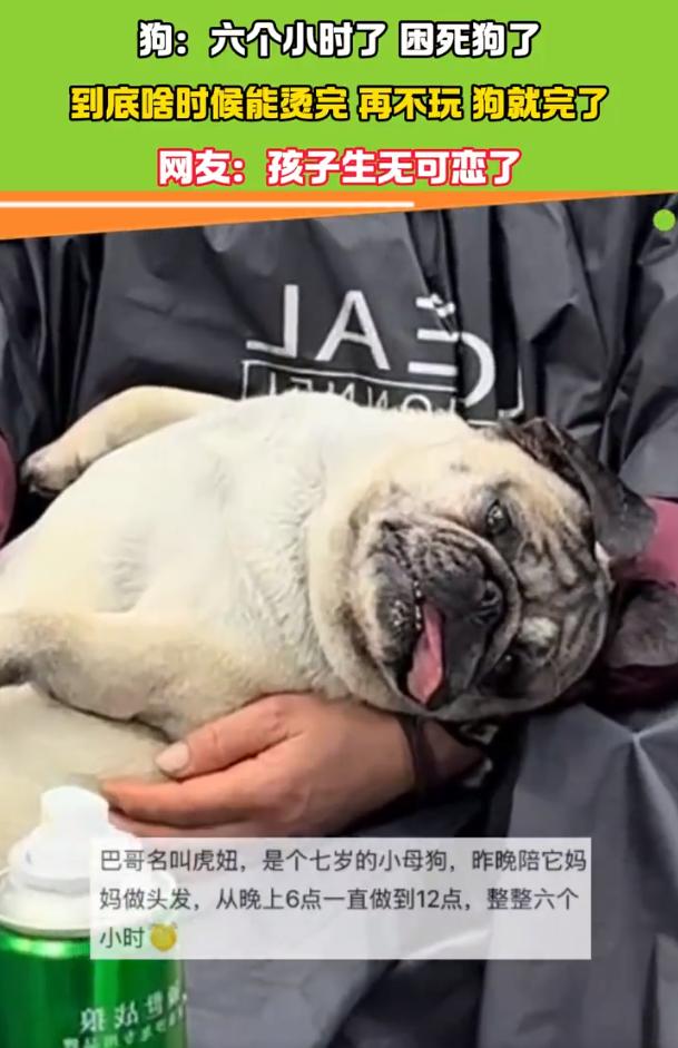 安徽一大姨烫头六小时,狗都等emo了 安徽一位大姨去理发店烫头,一坐就是6小时,狗子全程乖乖陪同。从一开始端正坐着等,到慢慢趴地上蔫儿了,最后直接眼神空洞、生无可恋趴在大姨身上,表情全程写满绝望。 这哪是陪烫头,分明是当代小狗新型酷刑啊!明明能回家躺平,非要在理发店熬到大半夜,忠诚是真忠诚,委屈也是真委屈。