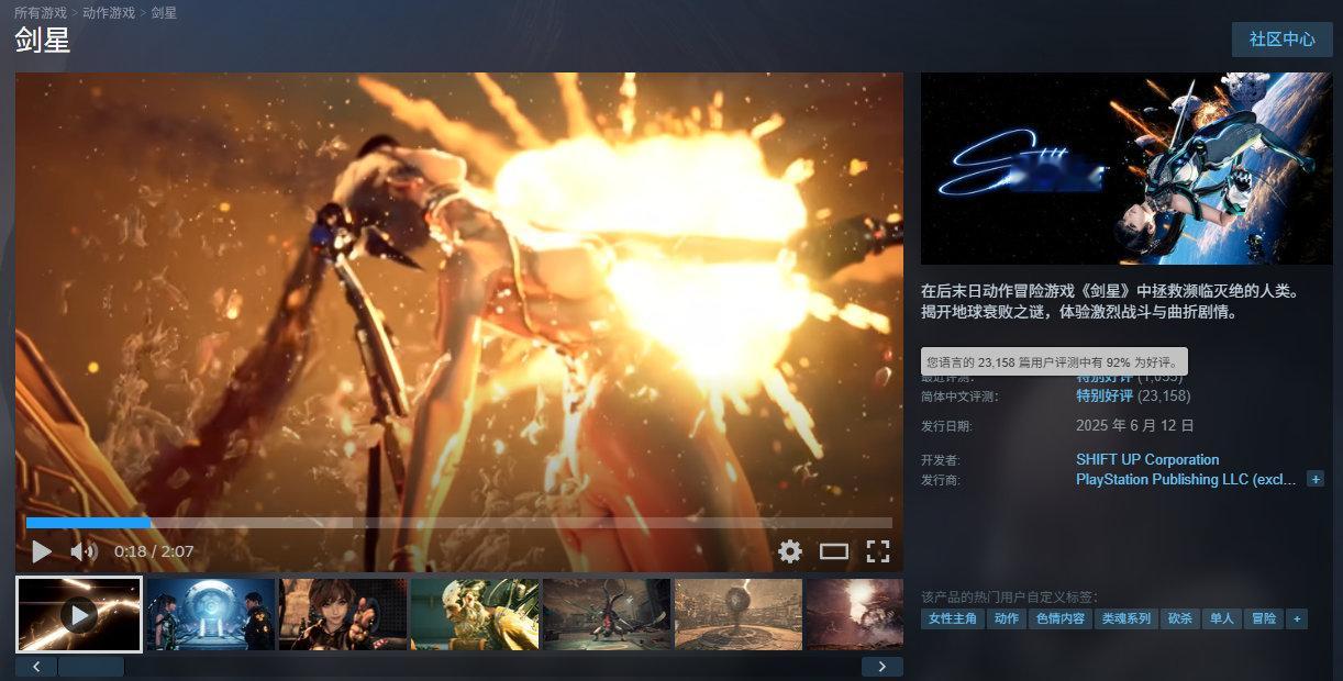 【就看裤衩子】动作冒险游戏《剑星》目前在Steam平台享新史低优惠,标准版折后201元,2月24日截止,支持中文,国区好评率为92%,收录超23000篇玩家评测。