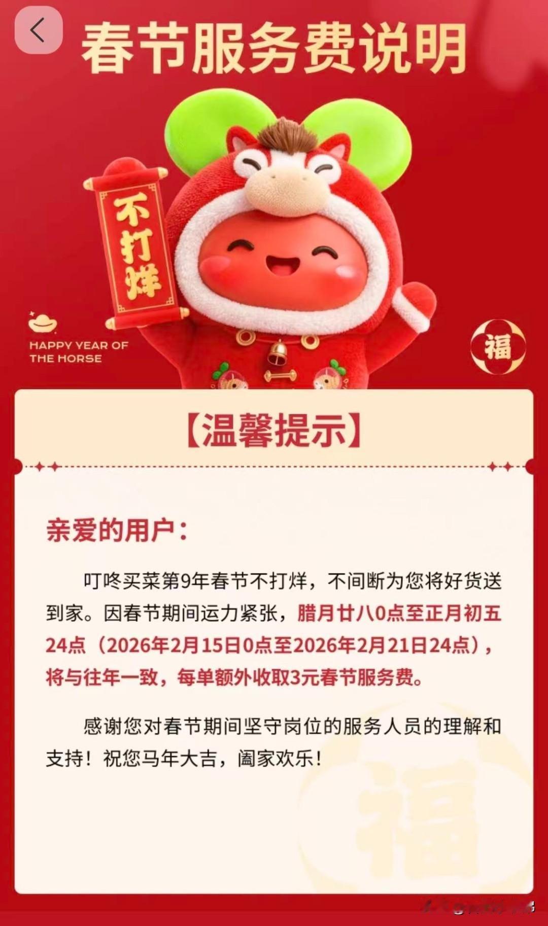 春节将至,线下不少店铺歇业,线上平台纷纷官宣春节不打烊,同时调整假期配送费。 山姆:2.11-2.24,每单加收3元春节运费,补贴坚守岗位的配送员。 盒马:2.14-2.21,所有用户统一6元/单基础运费,超重另算。 一边是节日运力紧张,一边是消费便利,平台加价保配送,你怎么看?