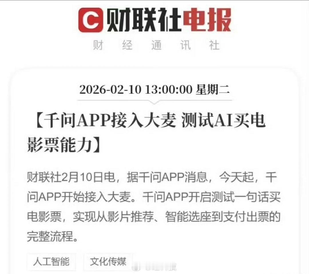 千问接入大麦千问测试AI买电影票能力 千问和大麦的合作,直接让AI购票从概念变成了可使用的实际功能。一句指令就能搞定电影票的所有操作,少了繁琐的步骤,多了便捷的体验。能感受到AI正慢慢融入日常小事,让生活里的小需求被更高效地满足,AI确实在改变我们的生活。