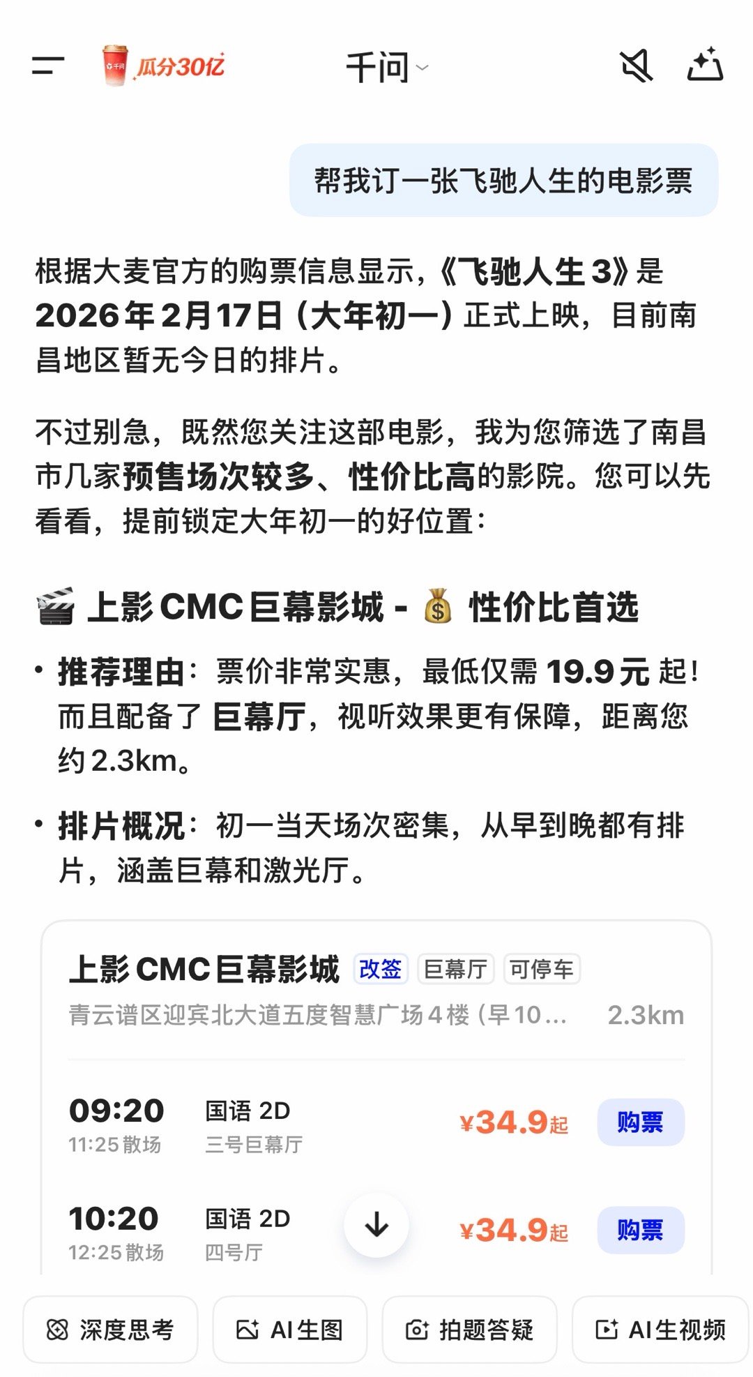 不知道大家最近用千问的体验感是不是很棒?现在AI买电影票真的来了!2月10日起,千问接入大麦,开启“一句话买电影票”测试!千问测试AI买电影票能力从影片推荐、智能选座到支付出票,全流程AI搞定,不用来回切换APP,一句话就能安排好观影行程,化繁为简,这就是幸福感!