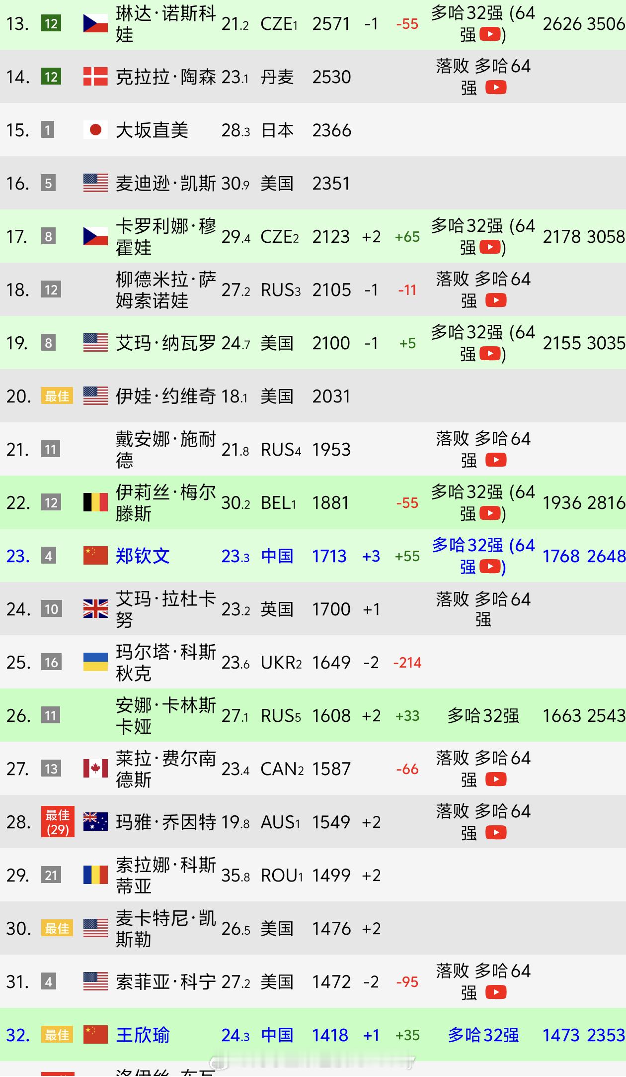 郑钦文即时排名上升到23位,夺冠排名将逼近top10