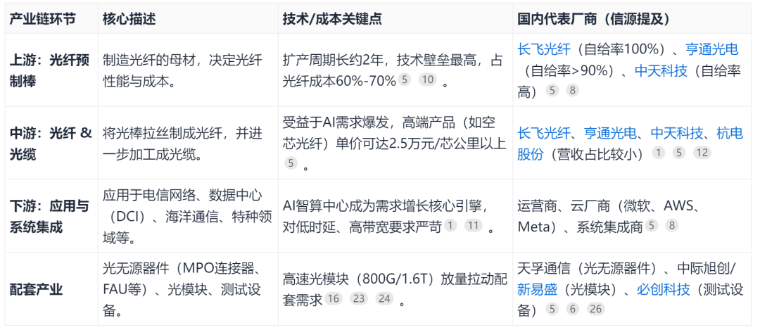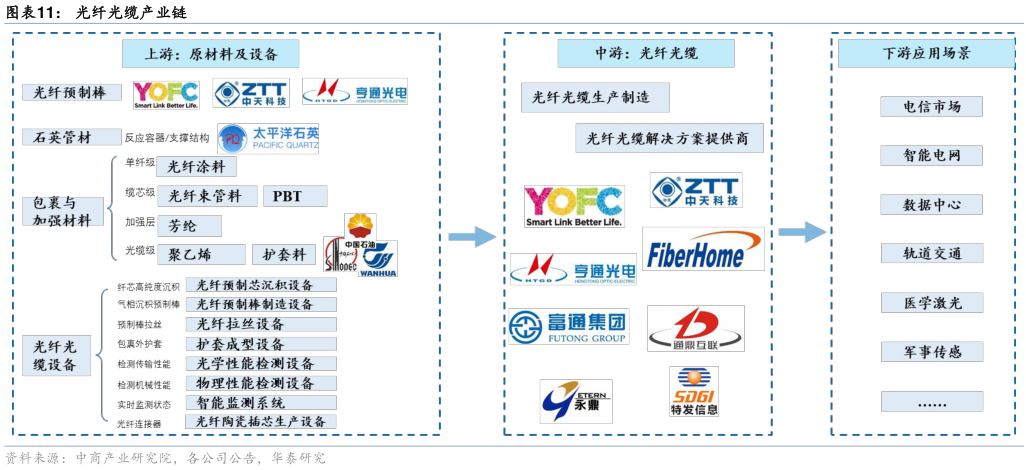 光纤产业链自上而下主要包括光纤预制棒(光棒)、光纤、光缆及下游应用。其中,光纤预制棒是技术壁垒最高、成本占比最大,约60%-70%的核心环节。