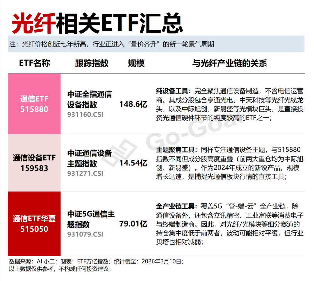 投资者可通过布局通信ETF(515880)、通信设备ETF(159583)、通信ETF华夏(515050),间接投资光纤光缆产业链的核心上市公司。