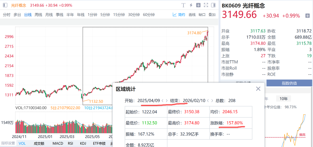 统计了一下光纤板块自2025年4月9日低点以来的涨跌幅,发现已经157.8%了,不到一年的时间里,45度角上扬,涨幅超过150%