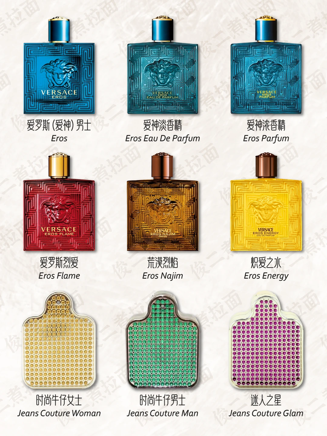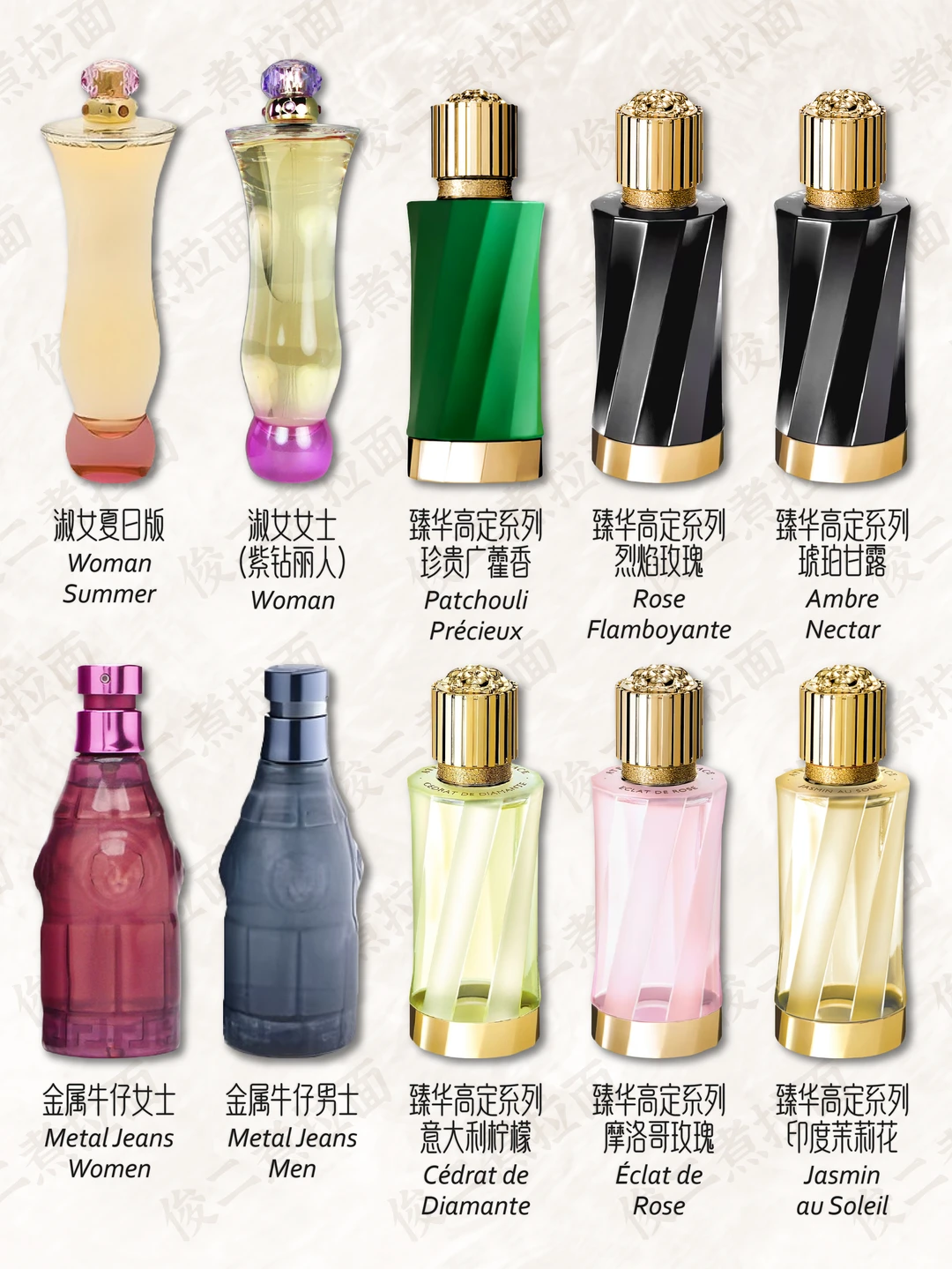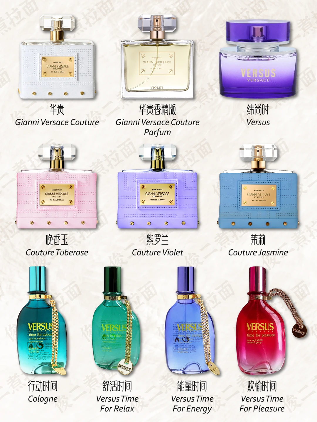 💎 香水在很早以前就是詹尼·范思哲的重要业务之一。他的第一款香水是专为女性设计,取名为“Gianni Versace”,于1981年问世,是一款花香西普调的香水,香水瓶被设计成引人注目的钻石形,棱形的底座,有56个切面的瓶身。1991年3月,VERSACE 推出“Versus”香水;1993年,推出 Red 和 Jeans 香水;1995年,首个 VERSACE 时装展在纽约举行;2018年年末,VERSACE 被美国轻奢集团 Michael Kors(后更名为 Capri 控股)收入麾下,成为该集团旗下品牌。
