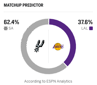 ESPN预测明日比赛:马刺胜率62.4%,湖人胜率37.6%