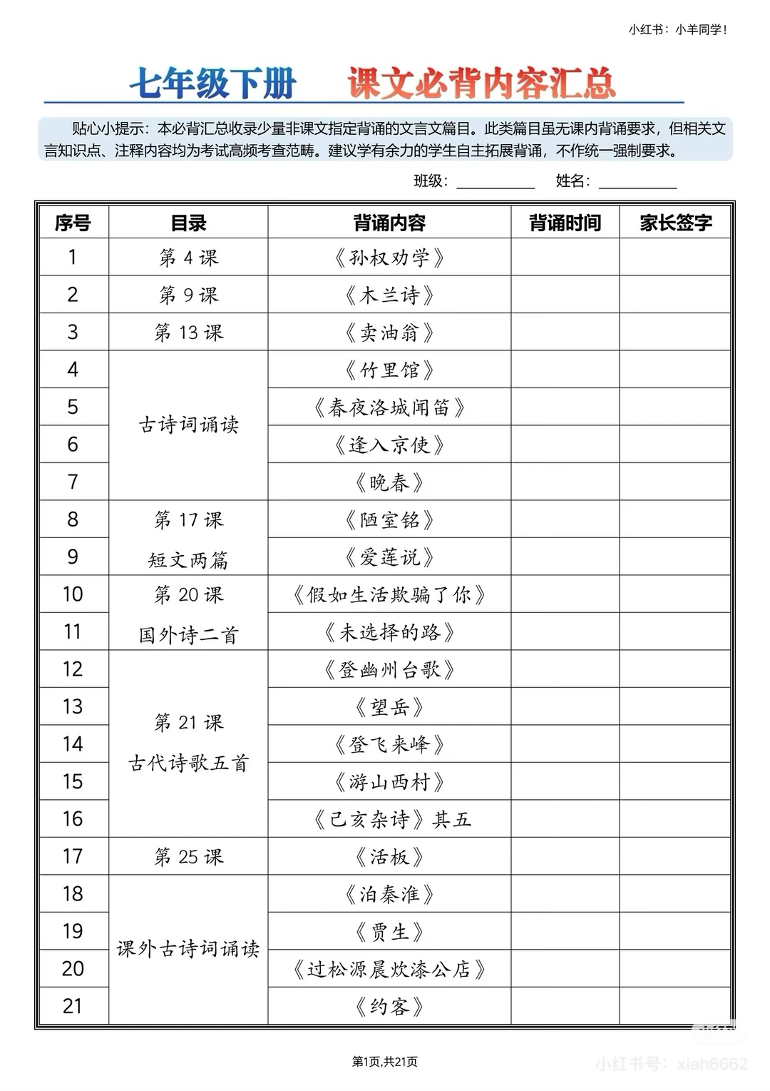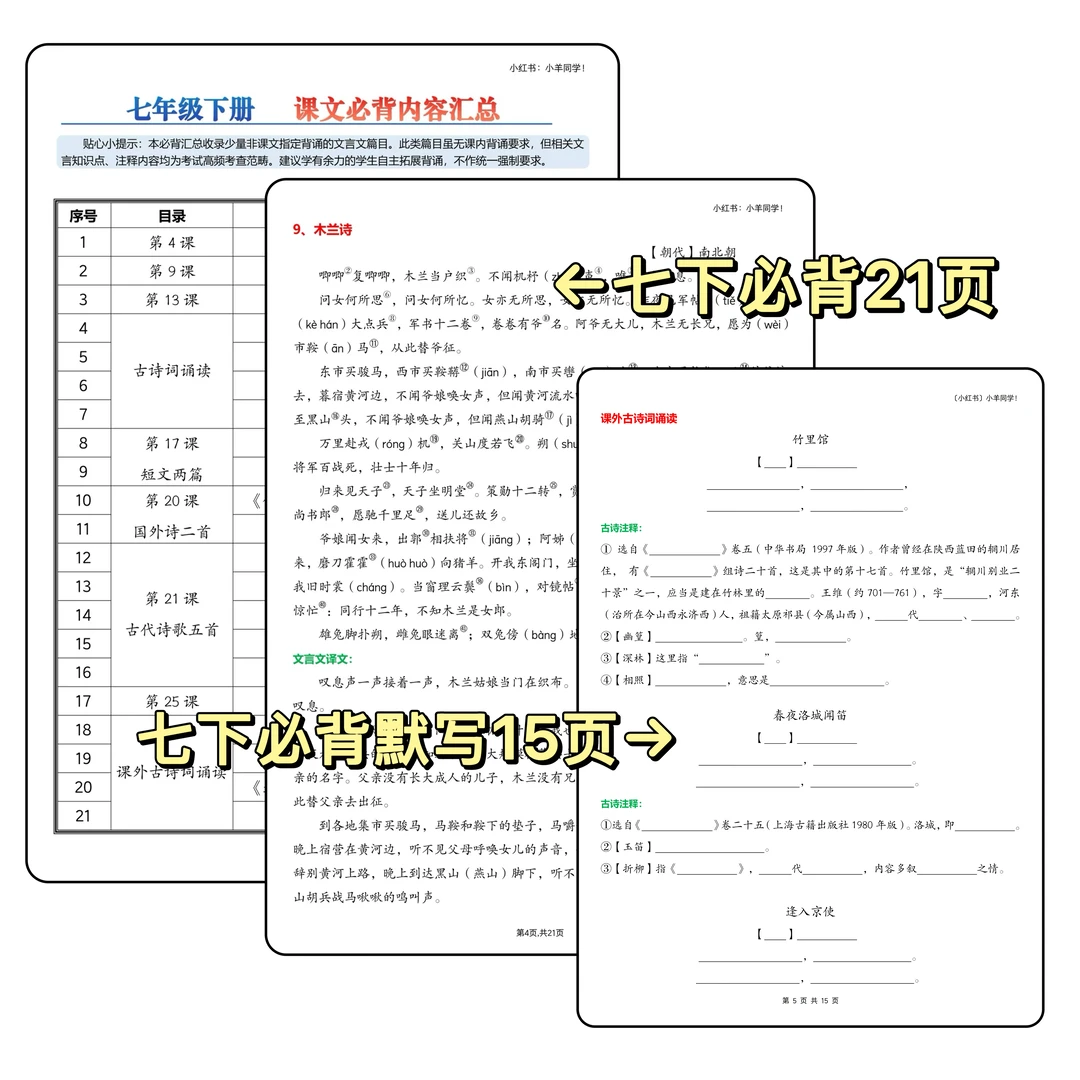最近整理的小学背诵内容默写,反馈的特别好,好多宝子问我,初中有没有默写呢??紧赶慢赶做出来啦~ 是不是有很多小朋友七下的必背已经完成了呢?赶快来测试一下默写的情况吧,一个寒假把必背吃透!!开学卷💥同班同学!!! 🗂️背诵默写文档15页,必背汇总21页。下单后一起发送。 ⚠️原创整理,禁止转载发布网络平台或商用,违者必究。