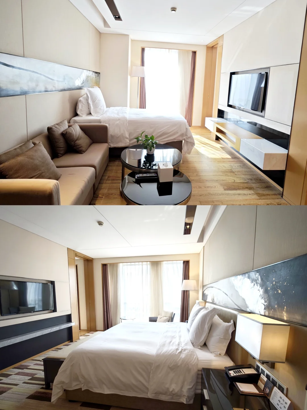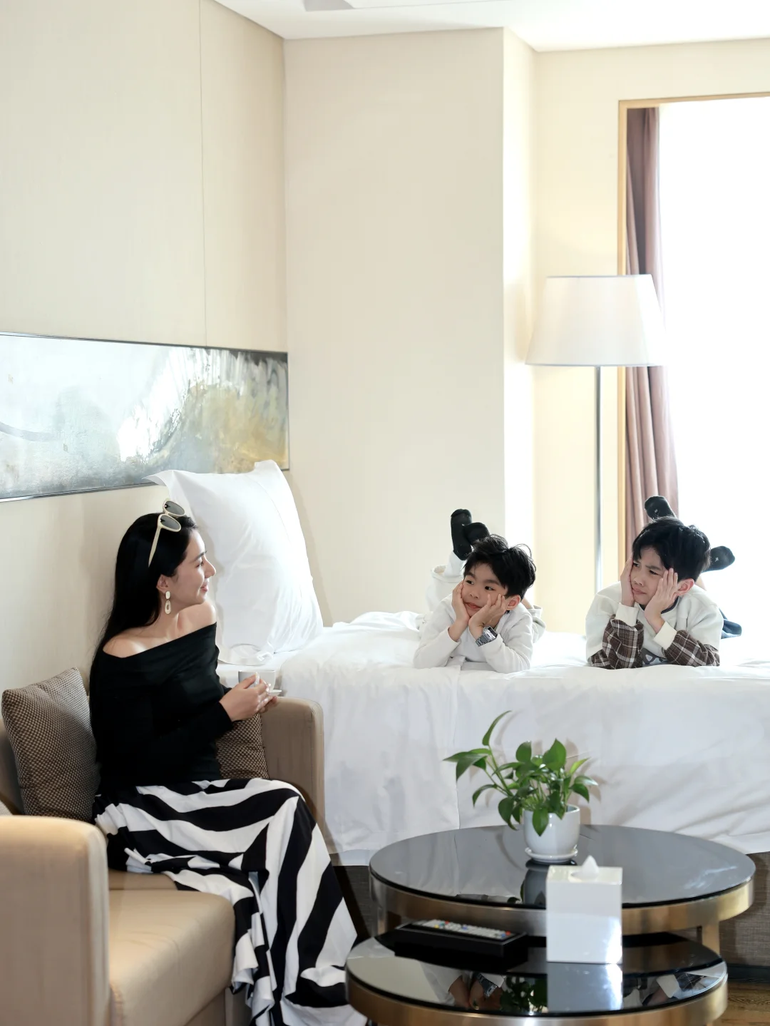我们订的是亲子双卧套房,面积很大,一张2米特大床+1.1米单人床,带娃睡完全不挤!床品用的是朗廷独家“静夜睡床”,丝涟床垫支撑感很好,还配了8种枕头可选,我一觉睡到自然醒🛌~房间还有保险箱、电动窗帘、热带雨林花洒,体验感拉满!