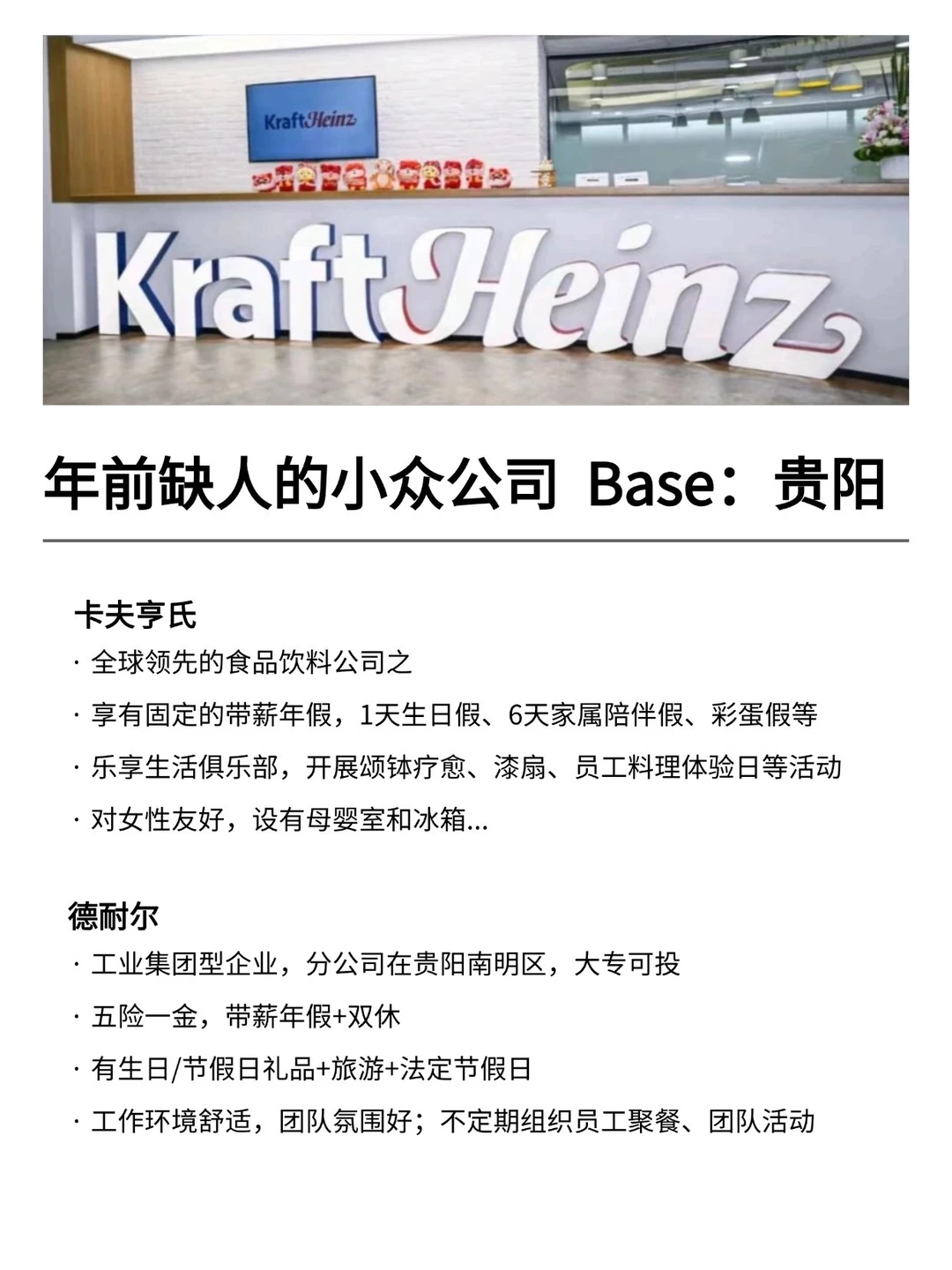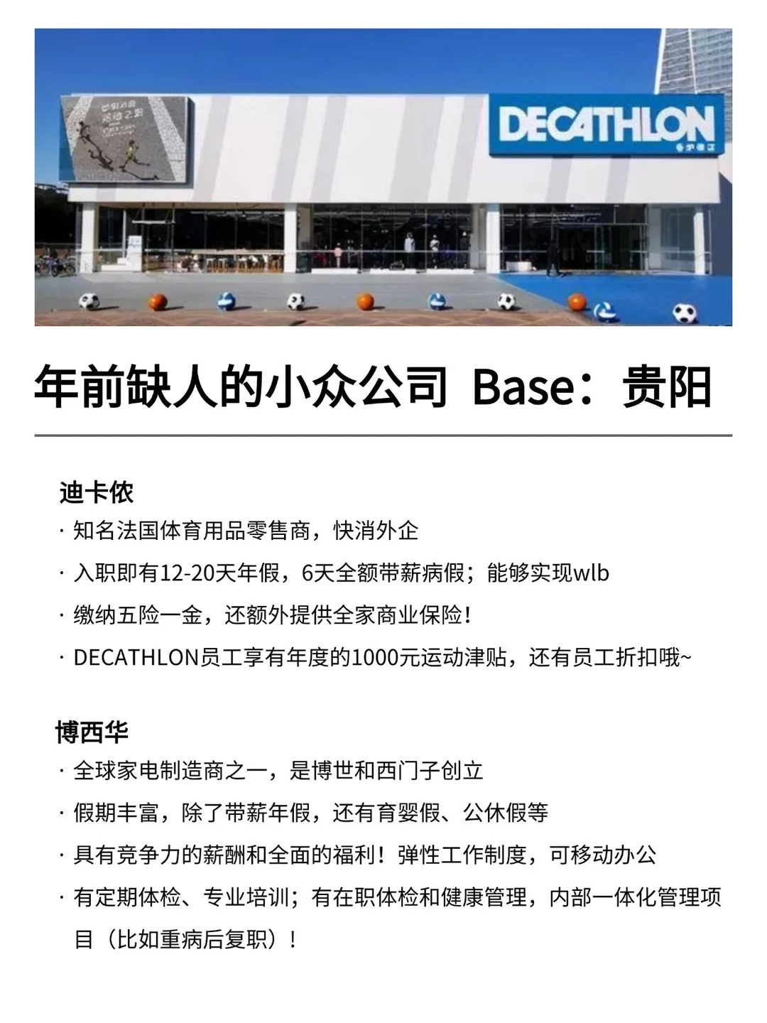 贵阳发展真的越来越好,有不少小而美、冷门宝藏的公司,机会是真的很多的! 特别是有不少小众冷门的外企,真心建议大家可以去试试 · 大家不要觉得外企很难进 其实外企也有一些常规类、英语要求没有那么高的岗位 · 为什么还是值得去外企? ▪️氛围好,对女性友好,年假长,基本上都是10天起步 ▪️很多还都支持居家办公、福利完善,是真的能实现WLB ▪️待遇也还不错,年后找工作的真的可以考虑考虑~ · 坚持日更✊🏻,帮大家在找工作路上顺利拿 offer! ·