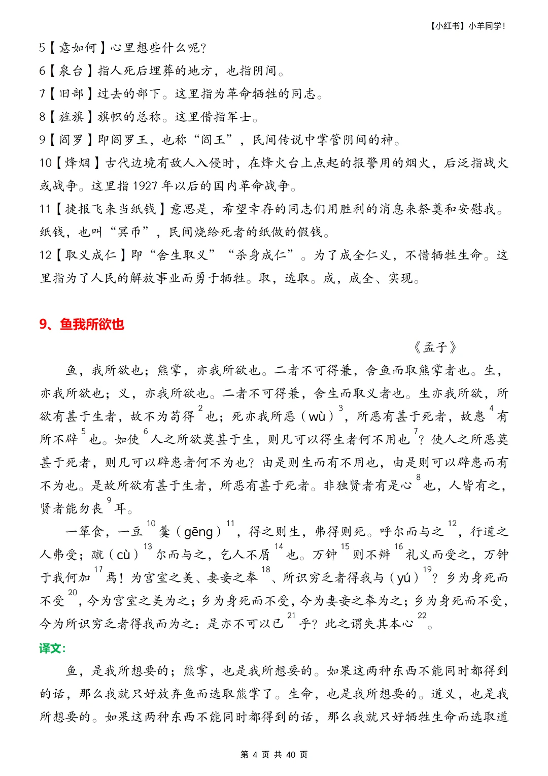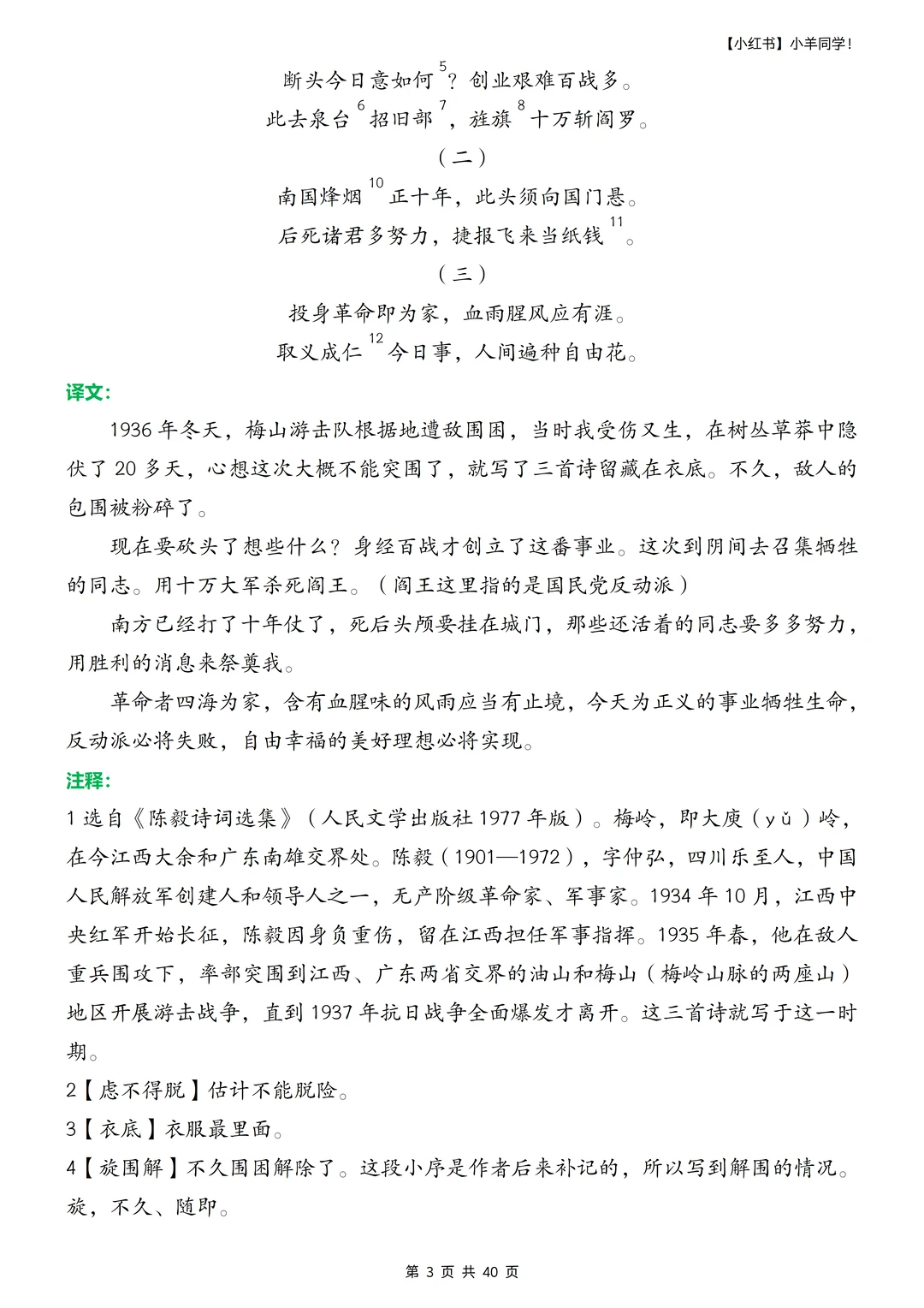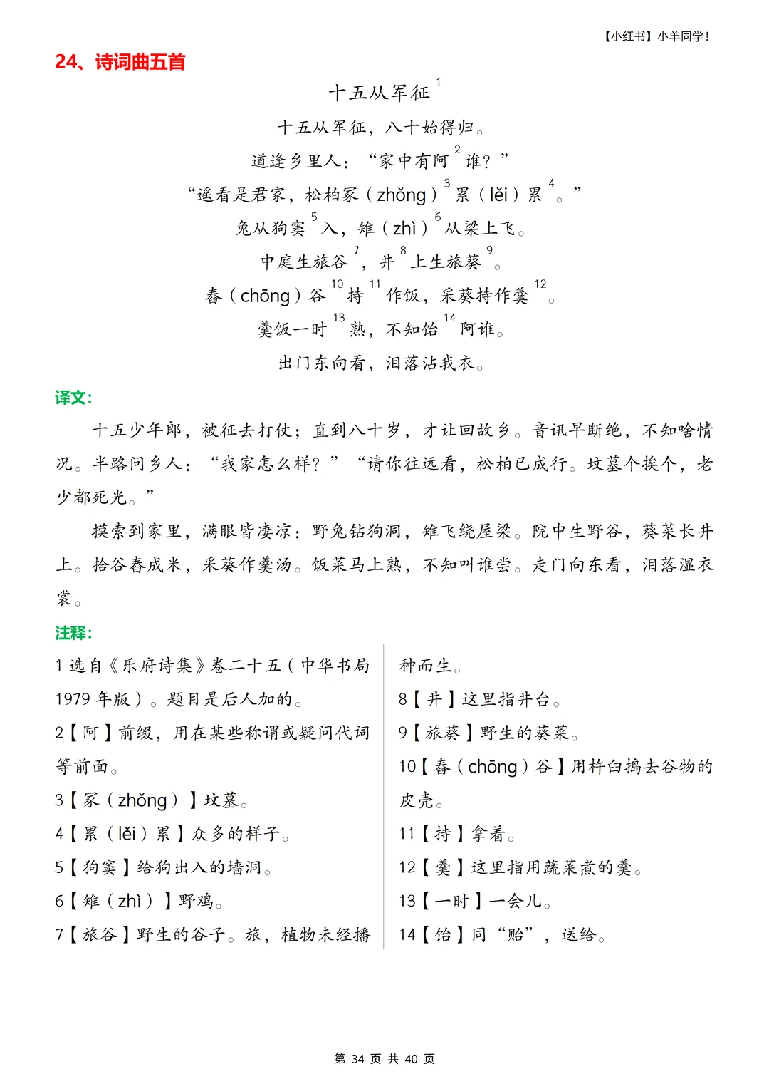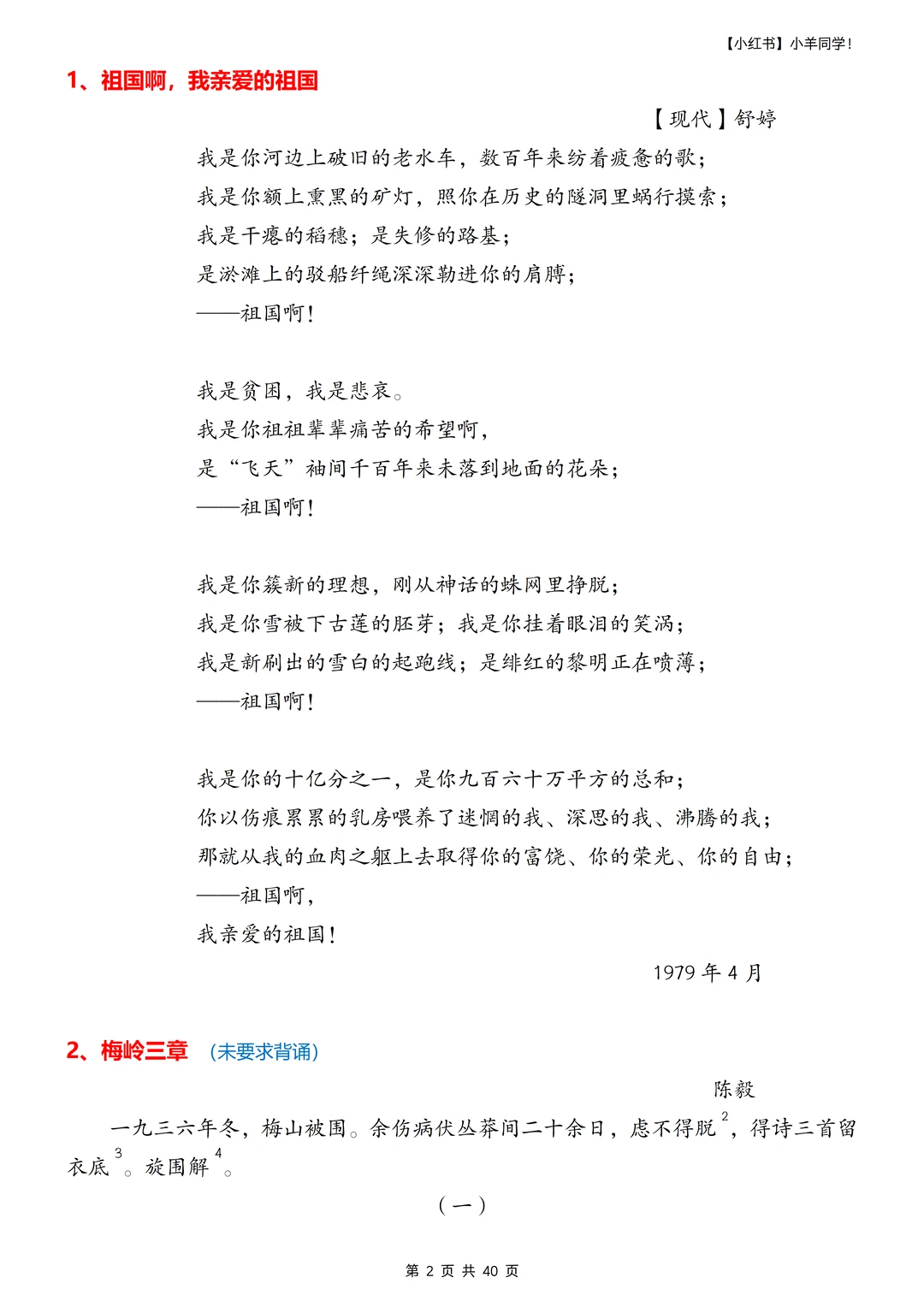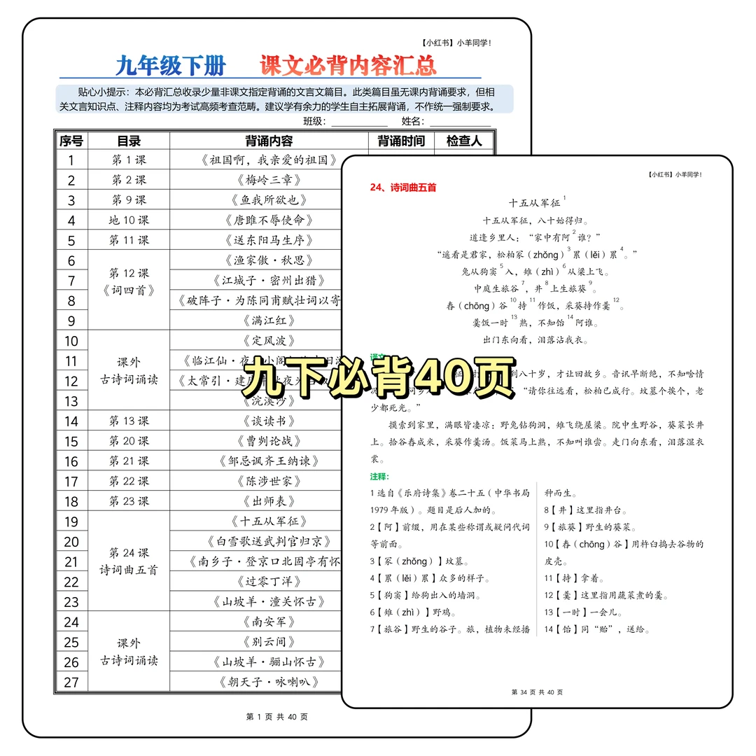 ▪️重新整理了九下需要背诵的内容,字词注释的小序号标注的我泪奔,太难搞了。 ▪️好几篇篇幅真的很长,不标注小序号,真的不知道注释在哪里~ ▪️部分课文未要求背诵,也做了汇总,如《梅岭三章》《唐睢不辱使命》《送东阳马生序》《陈涉世家》,虽教材未标注背诵,但是只要列入教材,就一定在考试范围内,通常会考文学常识、诗句理解及概括,关键字词含义等,建议熟读成诵,这些教材内未要求背诵篇目已标记(未要求背诵)字样。 ▪️寒假不卷,更待何时??提前背诵,不在基础内容上失分。