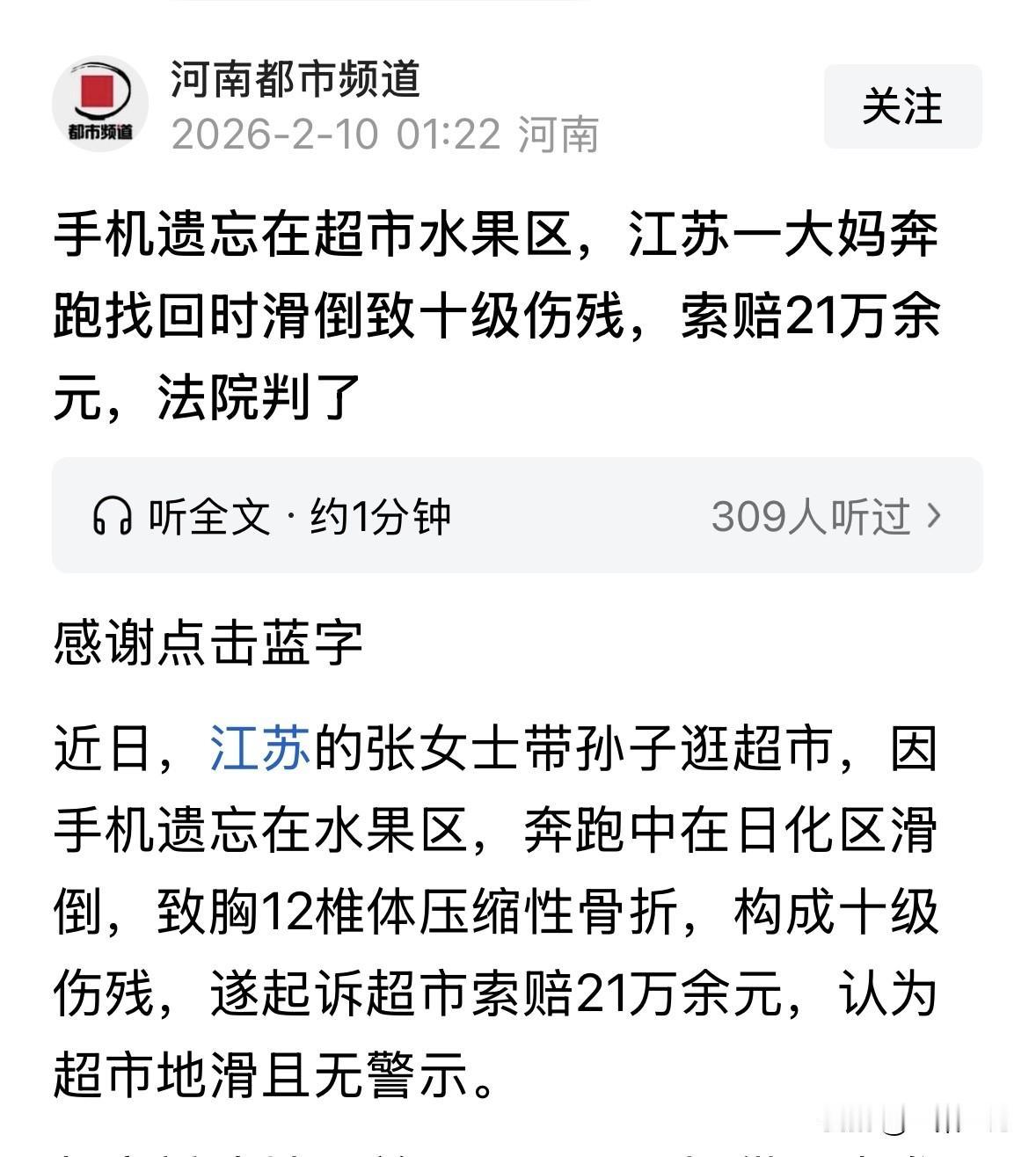 江苏,大妈在超市买东西,不小心把手机落在水果区,她一路狂奔回去找手机,结果跑着跑着脚下一滑,摔了个底儿朝天,到医院一查,摔成了胸12椎体压缩性骨折。大妈找超市算账,说地滑就算了,还没有警示标识,必须一分不少赔她21万!双方闹上法院,判决出乎意料。 那天,张大妈带着小孙子去超市购物。 她上了年纪,记性不太好,逛到水果区挑挑拣拣的时候,随手把手机搁在货架上了。 等买完准备结账时,她一摸口袋才发现手机不见了。 张大妈这下着急了。她手机里不仅有钱,还有各种照片和绑定的银行卡,丢了可不得了。 这可得赶紧回去找,晚点被别人拿走了就坏事儿了。 因为太着急,她也顾不上孙子了,她把孩子往旁边一放,交代一句:你别乱跑!接着就自己撒开脚丫子就往水果区跑。 没想到这一跑,手机还没拿到呢,人先出事了。 从水果区到日化区中间有一段路。张大妈跑得气喘吁吁,眼睛只顾着盯着前面,脚底下也没留意。 就在她跑到日化区的时候,突然感觉脚底一滑,整个人失去了平衡,重重摔在地上。 这下摔得不轻,张大妈当时就觉得腰背部一阵剧痛,想爬都爬不起来,冷汗瞬间就下来了。 周围的人赶紧过来扶,一看大妈脸色煞白,赶紧叫了救护车。 到医院一检查,胸12椎体压缩性骨折了!通俗点说,就是腰椎那块骨头被压扁了。 后来做了鉴定,构成了十级伤残。这可不是小伤,以后阴天下雨腰就疼,干重活更是别想了。 张大妈躺在病床上,越想越委屈,越想越生气。她觉得这事儿不能就这么自认倒霉。 她认为,自己是在超市里摔的,超市地面太滑,而且连个“小心地滑”的牌子都没有,这才导致她摔倒。超市必须负责! 于是,张大妈一纸诉状把超市告上了法庭,张口就要赔偿21万多块钱。 这21万里包括了医疗费、误工费、还有残疾赔偿金等等。 超市那边是一点也不认。负责人一听要赔21万,头都大了。 他说:我们地面是防滑的,当时根本就不湿,是她自己跑太快没站稳,怪不得我们。 为了证明清白,超市还提供了事发时的监控录像。 双方各执一词,闹到了法院。 法官审理认为,首先张大妈作为一个成年人,带着孩子在公共场所,应该知道奔跑是有风险的。 为了拿个手机,在超市里急吼吼地跑,自己没看路,这显然是自己没尽到注意义务。 再说超市。虽然超市喊冤说地面不滑,但他们提供的监控视频是不完整的,有死角。 作为经营者,你有义务保证顾客的安全。地面到底干不干净?有没有刚拖过地没干的情况?因为监控缺失,超市没法证明自己完全尽到了安全保障义务。 而且,作为高档超市,在容易滑倒的区域是不是应该有更明显的警示?这方面超市确实有管理上的瑕疵。 《民法典》第1198条规定:宾馆、商场、银行、车站、机场、体育场馆、娱乐场所等经营场所、公共场所的经营者、管理者或者群众性活动的组织者,未尽到安全保障义务,造成他人损害的,应当承担侵权责任。因第三人的行为造成他人损害的,由第三人承担侵权责任;经营者、管理者或者组织者未尽到安全保障义务的,承担相应的补充责任。经营者、管理者或者组织者承担补充责任后,可以向第三人追偿。 超市作为经营者,负有保障顾客安全的法定义务。虽然超市辩称地面不滑,但其提供的监控不完整,无法证明事发时地面状态及已尽到充分的警示或防护义务,存在管理瑕疵,所以需要承担侵权责任。 然而,法律并非要求经营者承担绝对责任。张女士作为完全民事行为能力人,在公共场所为取手机而奔跑,未尽到对自身安全的基本注意义务,其自身过错是导致摔倒的直接原因。 所以,法院最后拍板:张大妈自己承担主要责任,超市承担次要责任。 具体比例是:张大妈自己背85%的锅,超市背15%的锅。 算下来,张大妈原本要的21万多,法院最后只判超市赔3万多块钱。 拿到判决书,张大妈心里肯定不是滋味。本来想着能赔个大头,把以后的医药费、营养费都覆盖了,结果只拿到了零头。但没办法,法律讲究的是证据和过错程度。你自己跑得太疯,这个责任谁也替你背不了。 超市那边呢,虽然只赔了3万,但也算是买了个教训。监控不全、管理有漏洞,以后再遇到这种事,还得吃哑巴亏。 对于这件事,你怎么看? 欢迎关注@一案一论