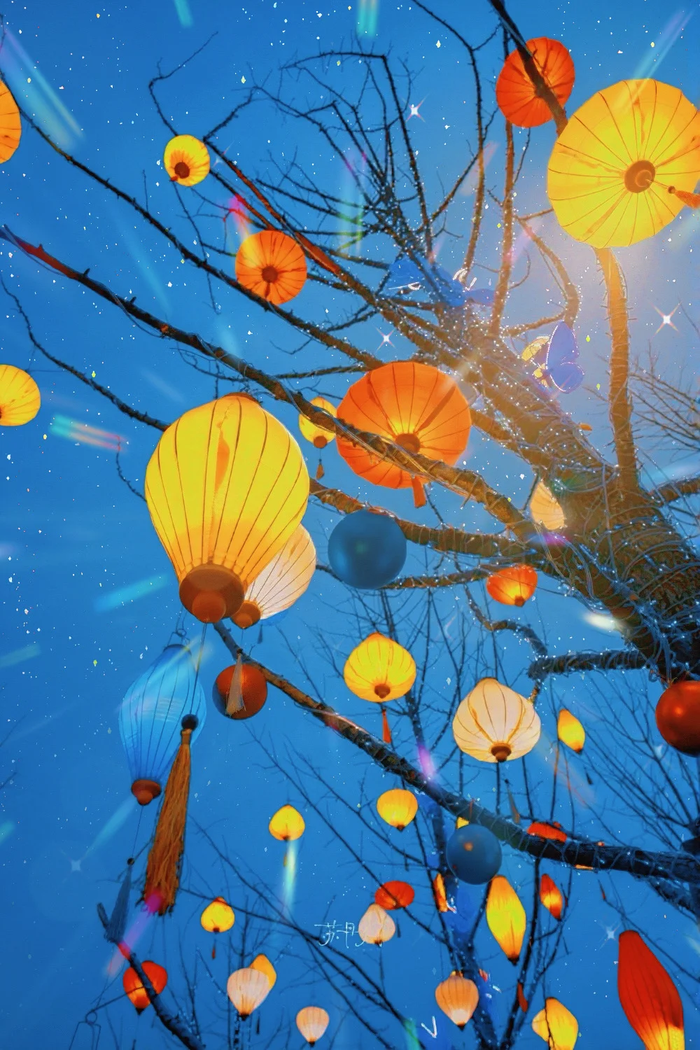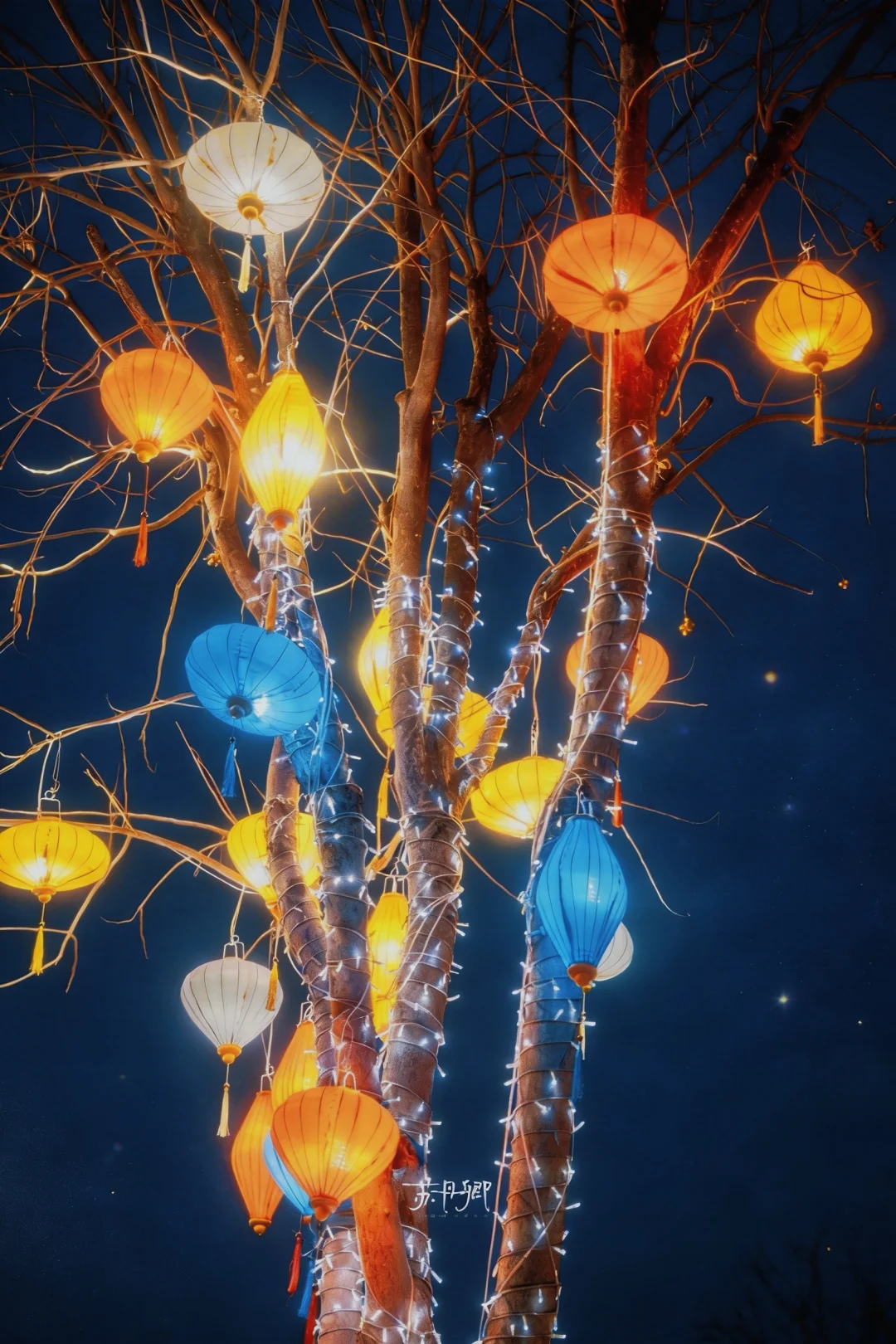 华灯初上的一瞬间,光秃秃的树枝仿佛一夜之间都“枯木逢春”了,五彩缤纷的彩色灯笼像花一样绚丽绽放,大光圈📷拍摄很有梦幻感,建议长焦虚化。