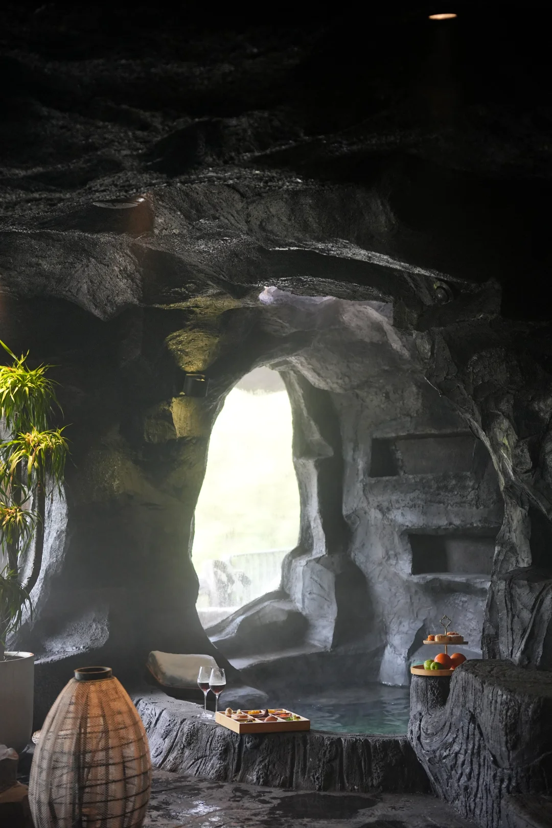在天然溶洞造型汤池里泡暖汤