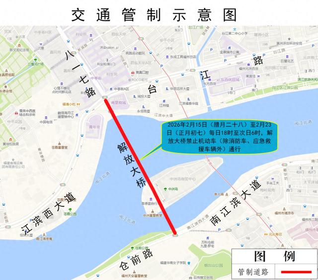 2026年2月15日(腊月二十八)至2月23日(正月初七)每日18时至次日6时,解放大桥禁止机动车(除消防车、应急救援车辆外)通行。