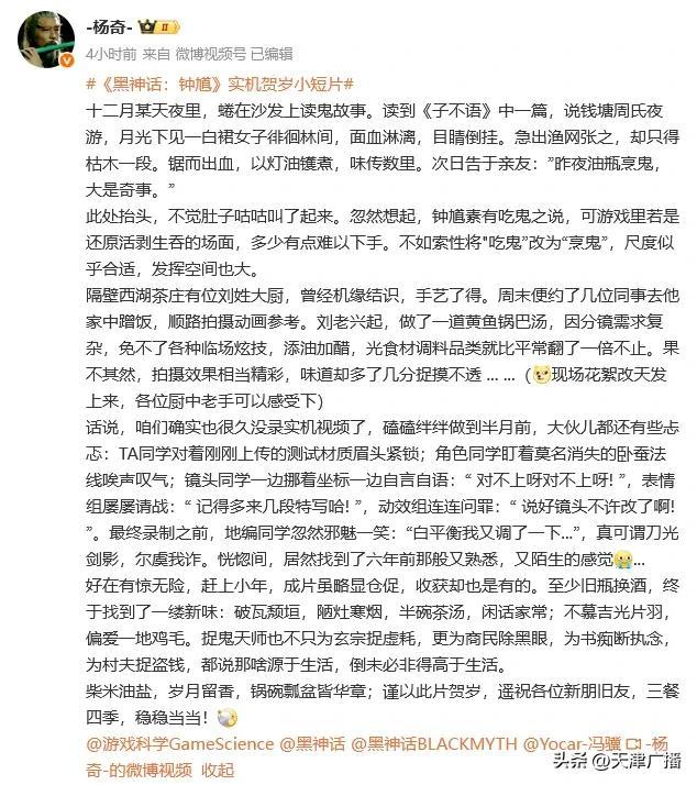 游戏科学创始人@Yocar-冯骥发长文谈该实机短片,称别这么严肃,知道(视频)没操作没战斗没玩法没钟馗,因为……根本没做啊(bushi天天都在舞刀弄枪,快过年了,能不能先坐下,认真喝口高汤,小心烫~如果这个拜年短片让你感觉到惊喜中混合着一丝怪异,温馨里带着几分猎奇,自己就相当满足了。