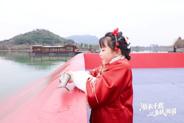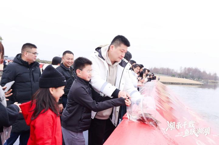 与往届“百人起网、鱼跃满舱”的丰收盛景不同,本届年鱼集从“捕鱼”转为“放鱼”,现场市民游客将千余尾鱼苗放入湖中,共计2000斤。