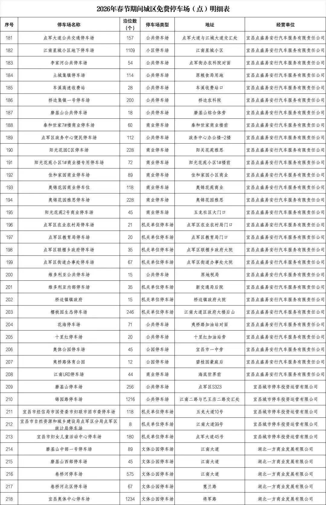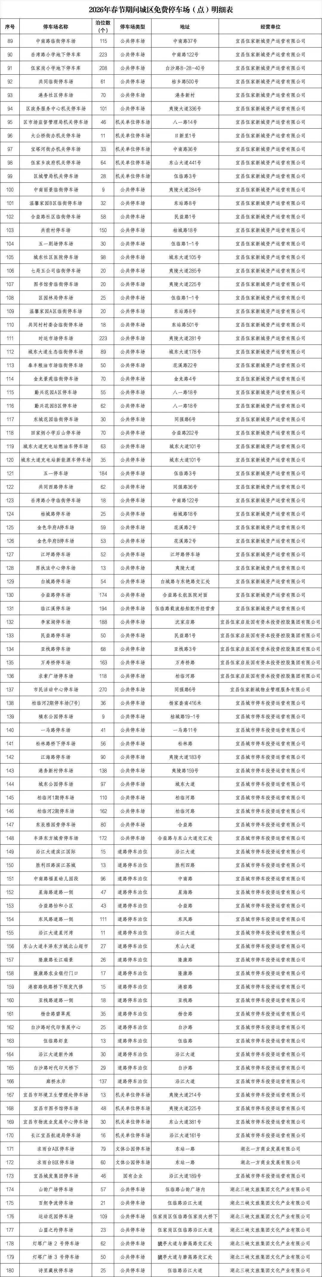 2月15日0:00——2月23日24:00,宜昌市城管委、宜昌市发改委联合相关国有停车设施运营企业,在全市范围内开展免费停车活动。宜昌城发集团自营公共停车场及道路临时停车泊位、部分县市区属国有停车运营企业负责经营管理的公共停车场、具备条件的机关事业单位内部停车场,全市713个停车场(点)、61570个泊位免费停放,其中城区有337个停车场(点)、24883个泊位。
