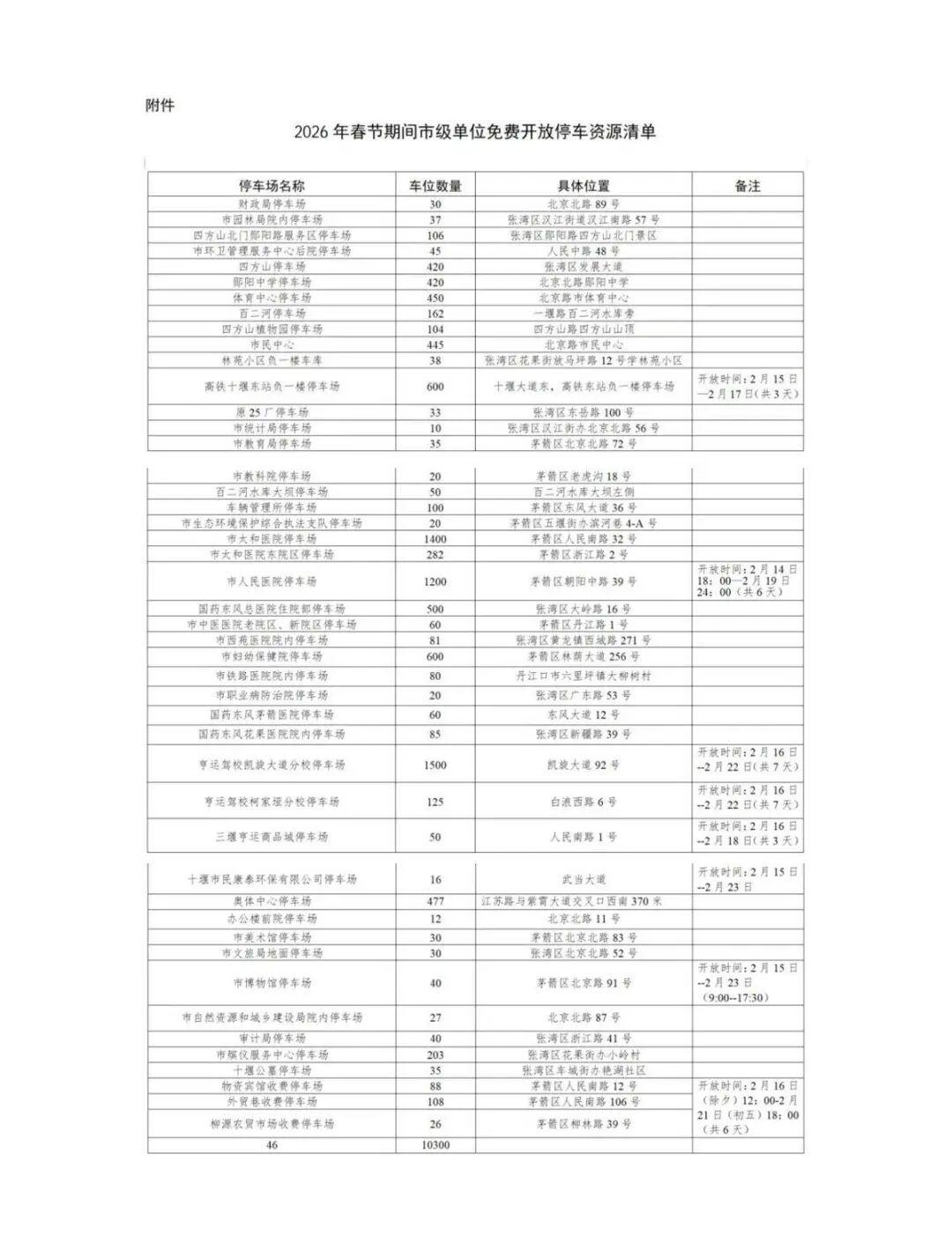 今年春节期间,十堰城区多家单位、46个停车场,共计10300个停车泊位将免费开放(仅限于公安交管部门登记的七座及以下小型普通客车)。据了解,这些停车场免费开放时间为2月14日18:00至23日18:00,少数停车位有特殊时间要求,具体以下图时间为准。