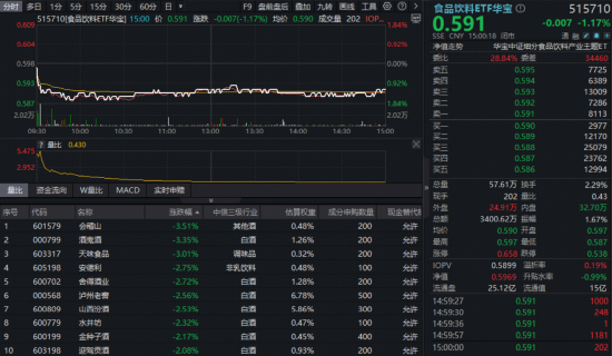吃喝板块今日(2月10日)大幅回调,反映吃喝板块整体走势的食品饮料ETF华宝(515710)开盘后迅速走弱,而后全天低位震荡,截至收盘,场内价格跌1.17%。