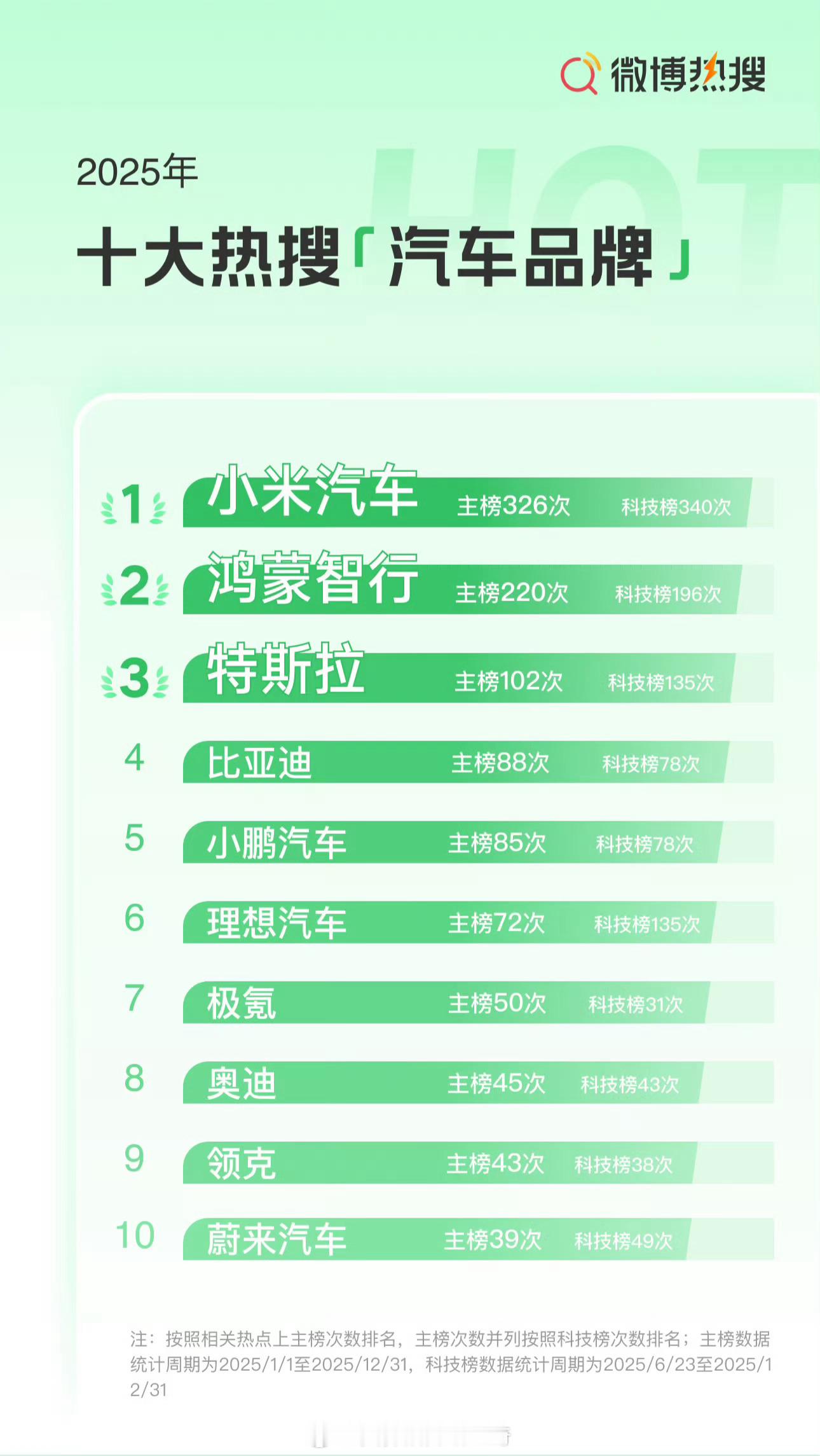 小米上榜2025十大热搜手机品牌TOP3小米手机+汽车一共上热搜 589次,华为手机+鸿蒙智行一共上热搜491次,苹果只是手机热搜891次!