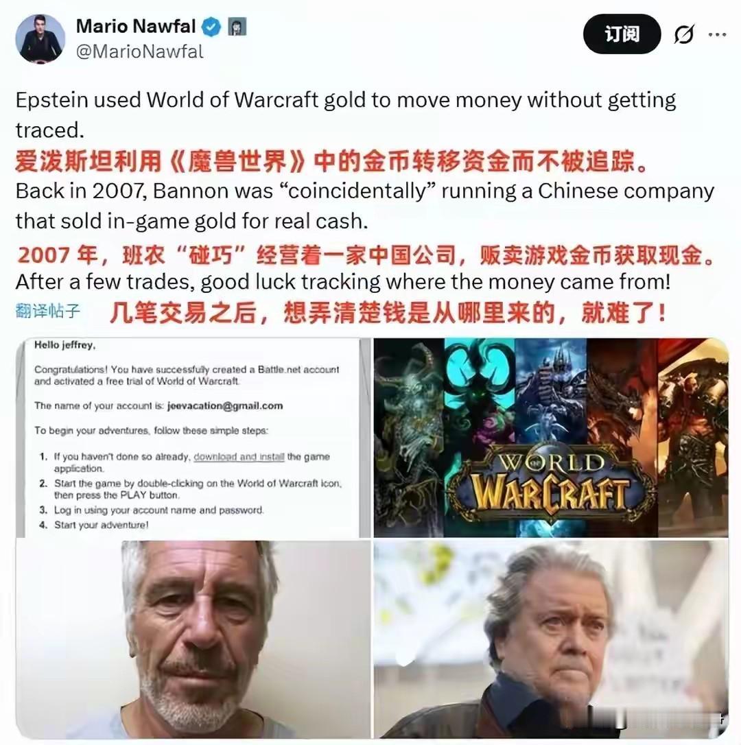 这个消息如果是真的,那么这个世界真的是太颠了! 魔兽世界这款经典的老游戏,居然变成了爱普斯坦洗钱的工具 而且特朗普的前高级幕僚班农就是里边的白手套 谁能想到魔兽世界里面的金币居然如此的肮脏,跟现实世界居然联系的如此密切 这游戏真的没法玩了 想一想游戏里面的亡灵族吧,没准就是现实的倒影