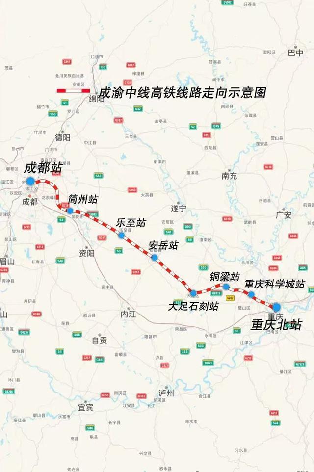 成渝中线高铁是我国“八纵八横”高铁网沿江通道的重要组成部分,线路自重庆枢纽重庆北站起,向西经重庆市两江新区、沙坪坝区、璧山区、铜梁区、大足区,进入四川省资阳市、成都市,最终引入成都枢纽成都站,正线全长292公里。建成后,成都至重庆50分钟可达,同时,线路将与已开通的西安至成都高铁、郑州至重庆高铁,以及在建的西宁至成都高铁、成都至达州至万州高铁、西安至重庆高铁、重庆至昆明高铁、重庆至万州高铁等多条线路衔接,将进一步优化成渝地区路网结构,对助推成渝地区双城经济圈建设、塑造西部大开发新格局具有重要意义。