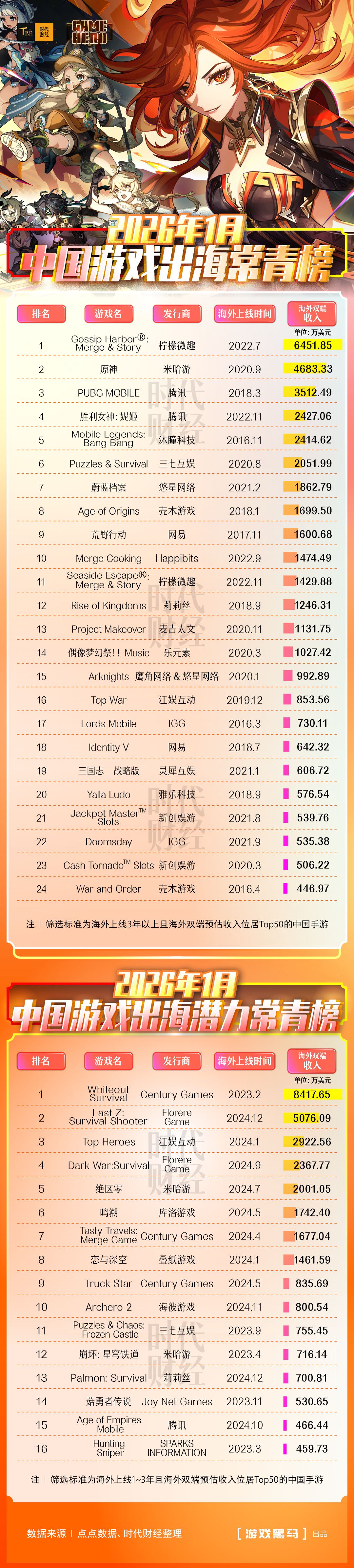 据统计,2026年1月共有《GossipHarbor®:Merge&Story(下称“GossipHarbor”)》《原神》《PUBGMOBILE》等24款游戏入围《出海常青榜》;同时,有《WhiteoutSurvival》《LastZ:SurvivalShooter》《TopHeroes》等16款游戏入围《出海潜力常青榜》。