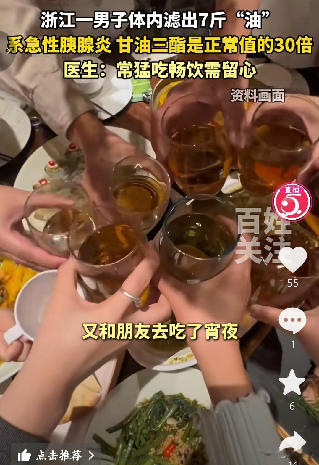 真不敢相信,这一大袋重7斤的油,是从一男子身体里抽出来的。 浙江这位男子,因为平时猛吃畅饮,结果得了急性胰腺炎,甘油三酯直接飙到正常值的30倍。医生给他做治疗,从他体内滤出了这么一大袋“油”,看着都让人头皮发麻。 这袋“油”就是身体发出的严重警告。很多人觉得年轻、身体好,就胡吃海喝,不把健康当回事,等到问题找上门,才知道后悔。 暴饮暴食、重油重盐,看似是一时的口腹之欲,实则是在透支自己的身体。健康从来不是小事,别等身体亮红灯,才想起要好好爱惜自己。