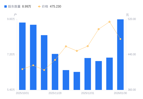 日期A股户数(户)流通A股户均持股数(股)户均持股市值(万元)2026-01-207046110273.72528.272026-01-096869210538.30524.282025-12-317023310307.07473.182025-12-196316911459.68513.812025-12-106409111294.82517.902025-11-287233210007.97428.242025-11-20818908838.67357.972025-11-10871988300.63345.052025-10-31883188195.37333.592025-10-20870178317.90332.85