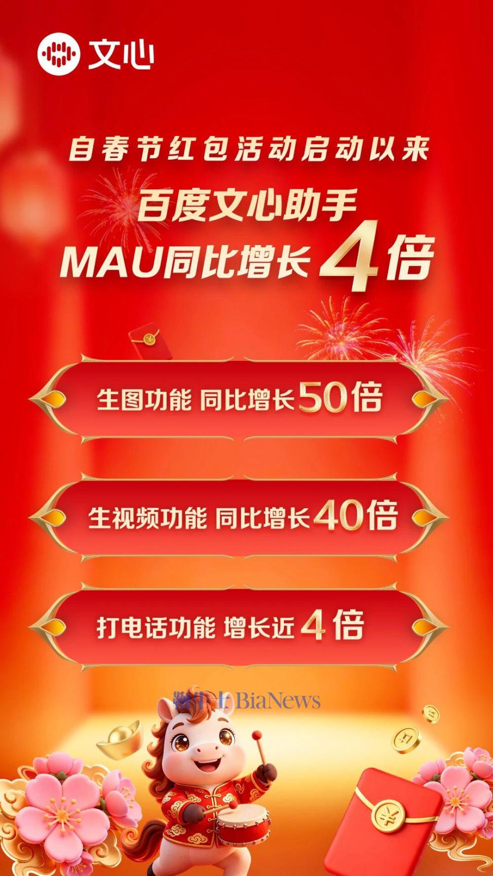 2月10日,百度文心官方宣布,自春节红包活动启动以来,百度文心助手MAU同比增长4倍。