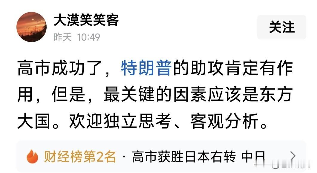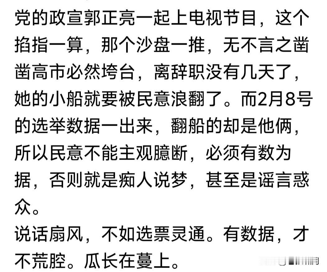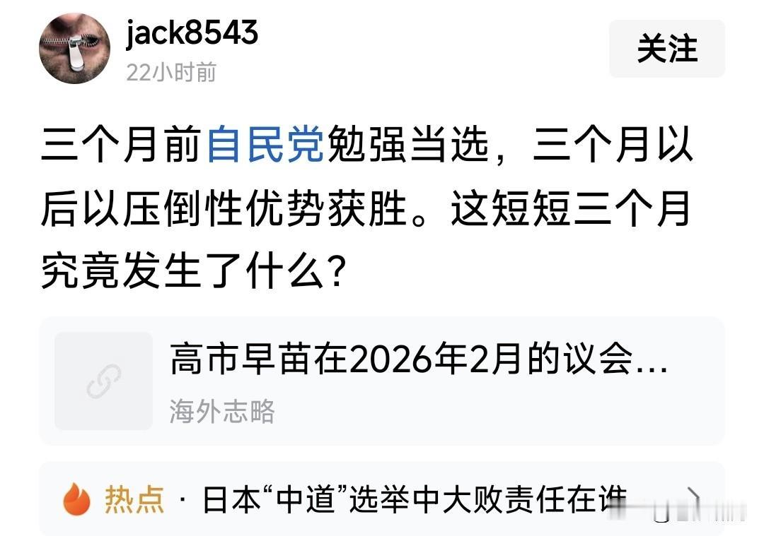 高市洗牌众议院,自民党绝对优势获胜,预示高市将重新担任日首相。网友与网红教授反应为何不同? 网友一说:三个月前自民党勉强当选,三个月后以压倒性优势获胜!这三个月内,到底发生了什么事情? 网友二说:高市再次成功,特朗普的神助攻起到了重要作用!但肯定还有其他原因,这些原因是什么呢? 沈逸教授:高市是全民选择的结果,她闯的祸也必须全民来承担!这话是什么意思?全民要怎么承担呢? 苍狼不知该说什么?谈一下看法吧! 1.月余前沈逸与台湾名嘴郭正亮,曾预测高市洗牌众议院,肯定要失败。因国内反对派联合发力阻击她。 2.自民党获得众议院超半数选票,说明极右派占了上风,但并非全部支持她,还有不少主张与中国友好。 3.沈逸教授预测不准,说明看问题还不行!至于“高市由全民选举,必须由全民承担”这种话,还是少说为好。因为怎么承担呢?要留有余地。 对于有些错话,我们站在理上,坚守原则据理驳斥,就做得很好!但不要说大话,中日是邻邦,解决好分歧,还要合作发展为两国人民谋福祉! …………