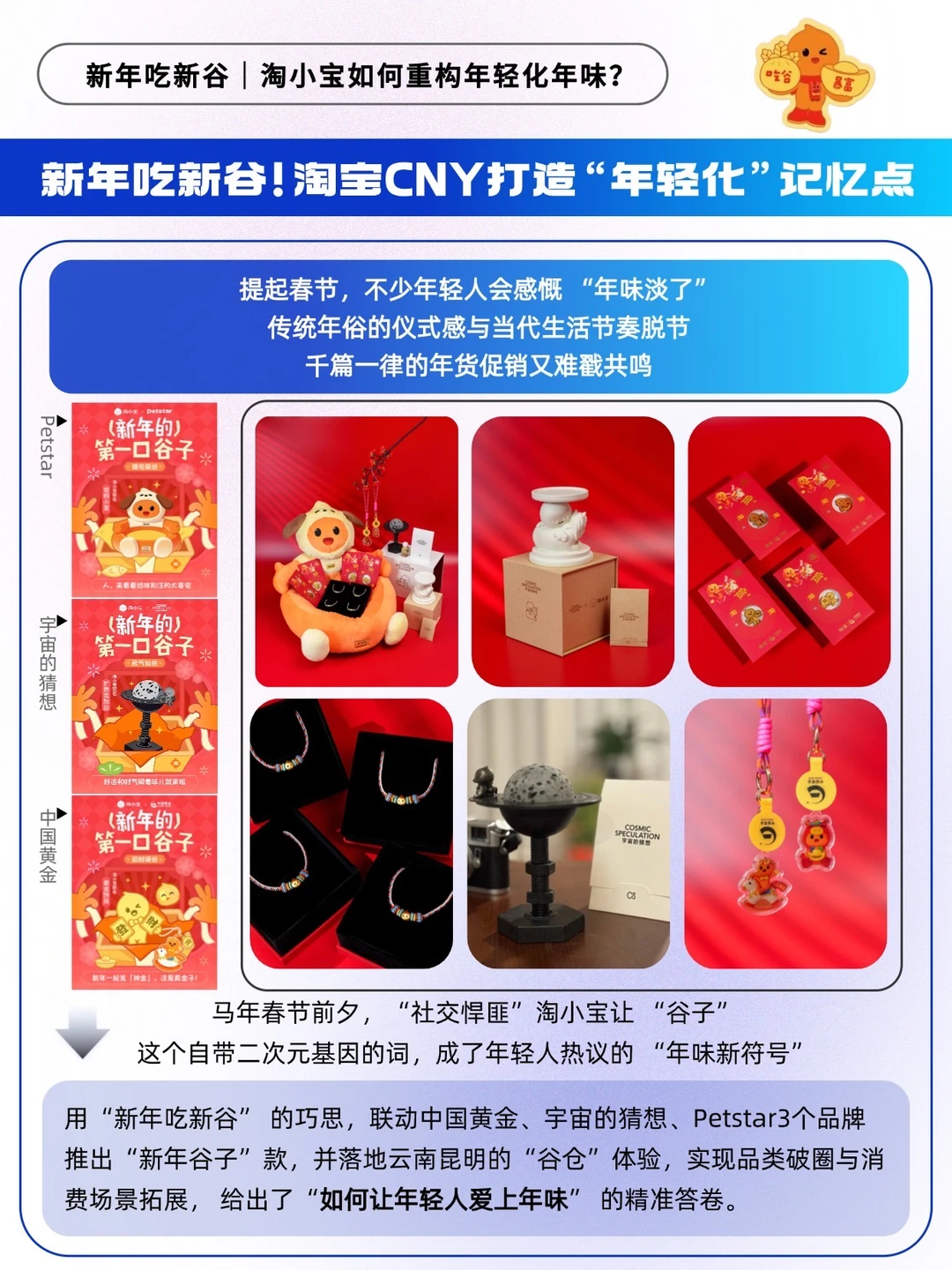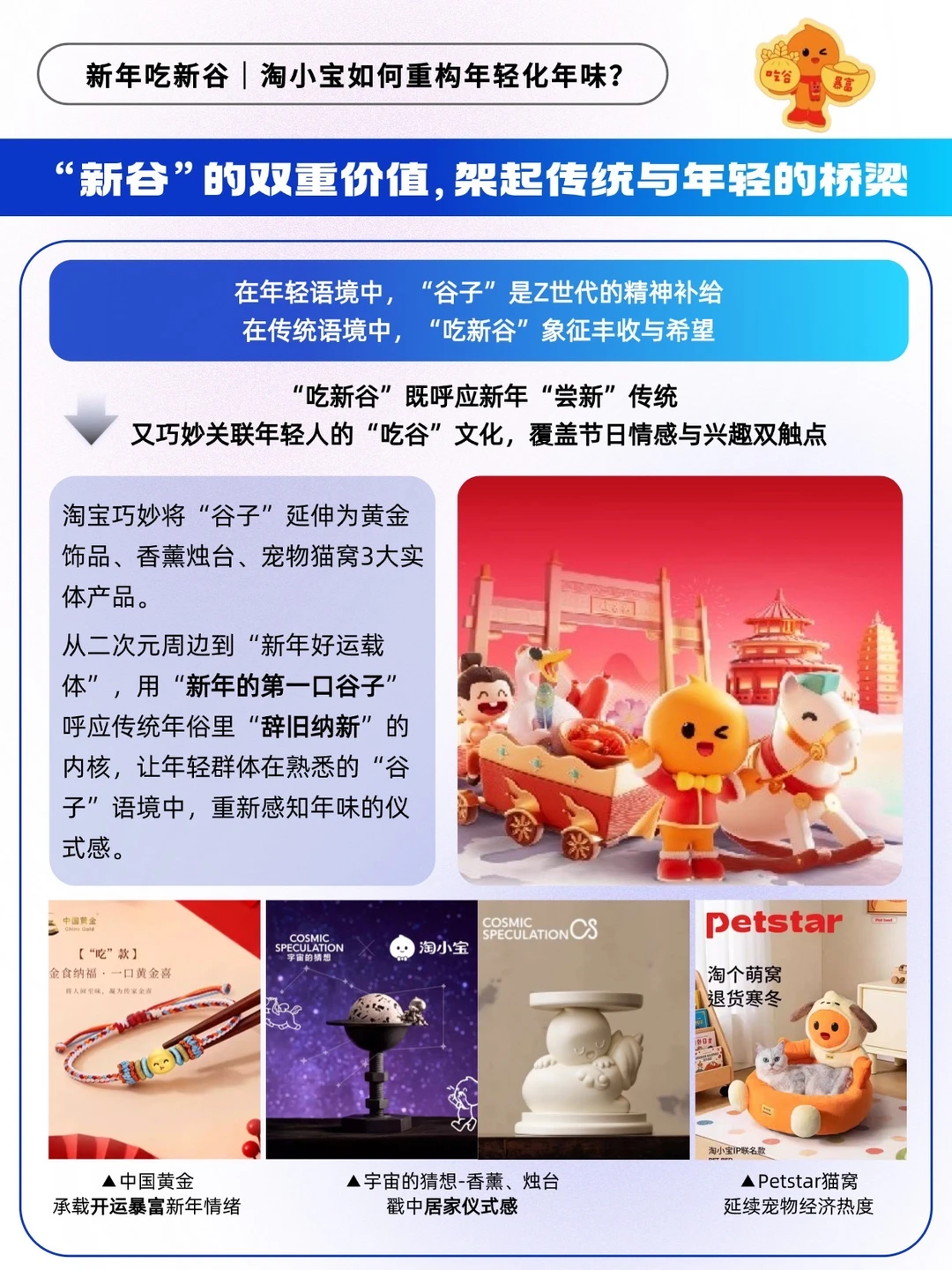🟠围绕黄金、香薰、猫窝三大品类,联动中国黄金、宇宙的猜想、Petstar三大品牌,淘小宝将抽象的年味落地为具象的生活好物,既承载 “开运暴富” 的新年期许,又戳中 “居家仪式感” 的消费刚需。