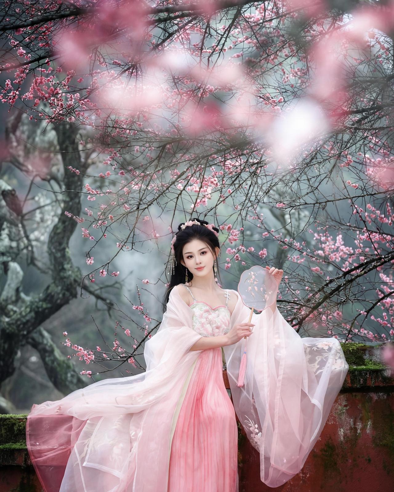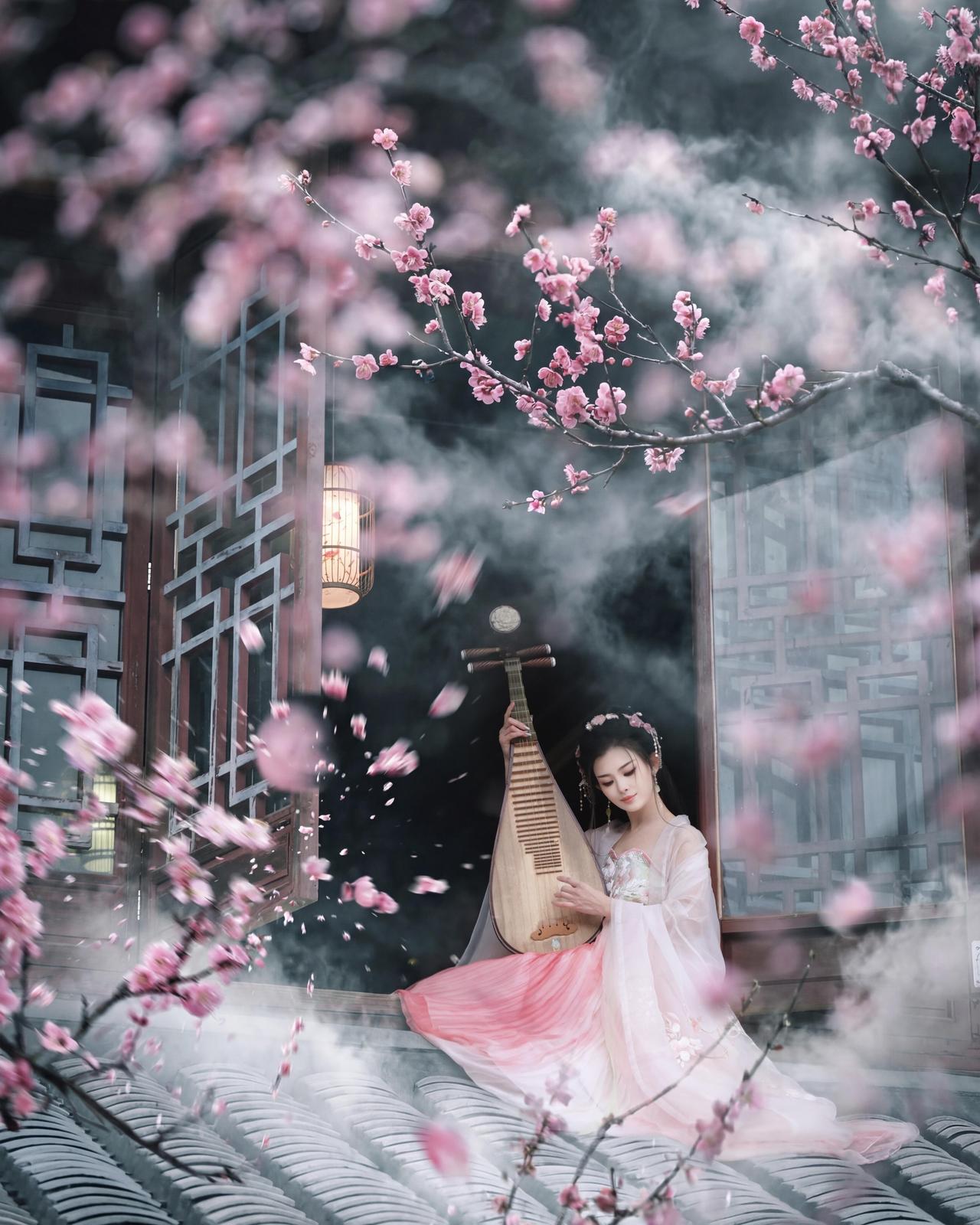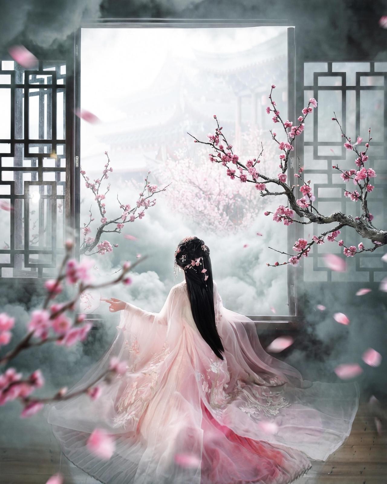 我们之所以喜欢这样的唯美作品,其核心优势在于“动静结合”的视觉张力。比如,飘落的花瓣与静止的檐下人物形成对比,让静态画面生出流动的诗意。 构图上,人物位于画面左下区域,遵循了三分法原则,右侧的窗棂与花枝则起到了平衡画面的作用,避免了视觉重心的偏移。色彩方面,粉白汉服与青瓦、木窗的色调和谐统一,没有突兀的色块,整体呈现出“淡彩”的画意质感。 光影上,摄影师巧妙利用了室内外的光线差,人物处于半明半暗的檐下,面部光线柔和,背景的雾气则被光线晕染出层次,增强了空间纵深感。美中不足的是,人物的坐姿略显僵硬,若能将身体微微前倾,或让团扇轻抵膝头,姿态会更显自然。